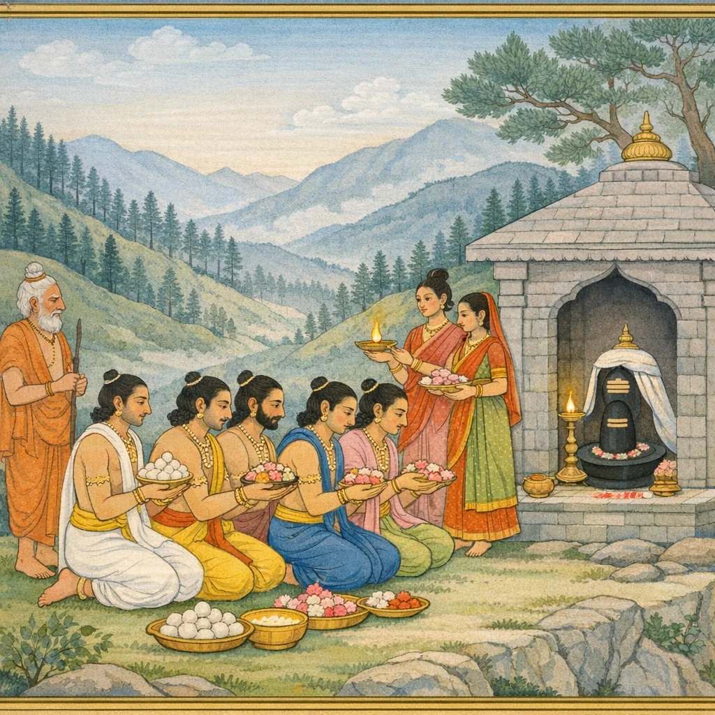 मोदकै: पायसेनाथ मांसापूपैस्तथैव च । आशास्य च महात्मानं प्रययुर्मुदिता भूशम्,तदनन्तर ब्राह्मणोंसे स्वस्तिवाचन कराकर सुरश्रेष्ठ महेश्वरकी पहले ही पूजा करके मिष्टात्न, खीर, पूआ तथा फलके गूदोंसे उन महेश्वरको तृप्त करके उनका आशीर्वाद ले समस्त पाण्डवोंने अत्यन्त प्रसन्नतापूर्वक यात्रा प्रारम्भ की