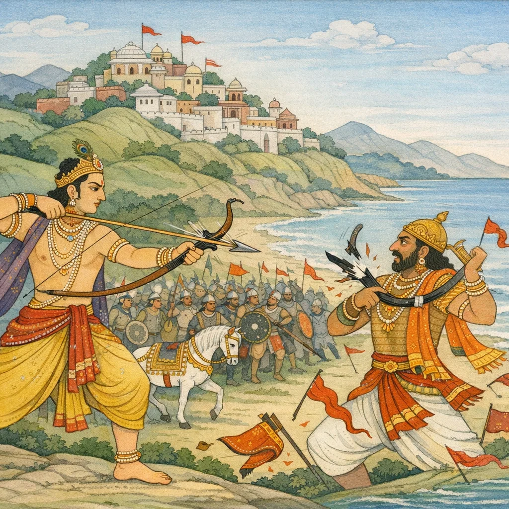 Though his body was being deliberately protected by Pārtha, the ambidextrous Arjuna, the king of Magadha took it to be the result of his own prowess and kept sending a continuous shower of arrows at Arjuna. The episode highlights how pride can misread another’s restraint and compassion as weakness, thereby escalating conflict.
