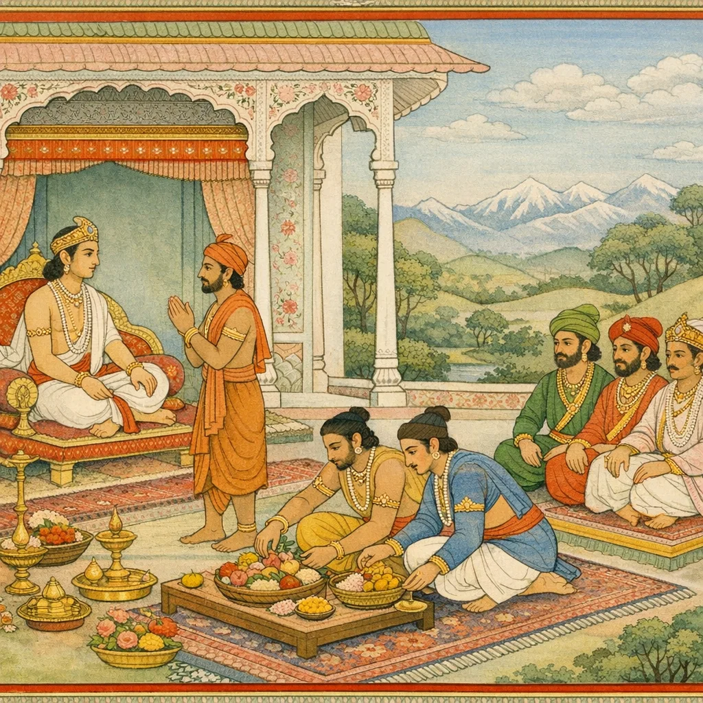 The chapter frames a governance dilemma rather than a personal crisis: how to assert imperial authority after conflict in a manner that is publicly accountable—through correct Vedic procedure, transparent preparation, and disciplined hospitality—rather than through renewed coercive campaigning.