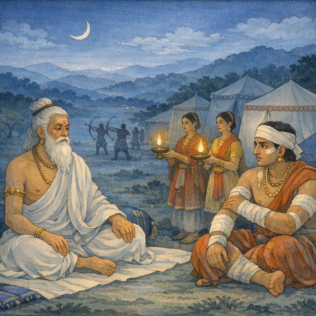Chapter Arc: छठे दिन के युद्ध के बाद दोनों सेनाएँ यथायोग्य विश्राम कर शिविरों की ओर लौटती हैं—पर विश्राम के भीतर भी अगले प्रहार की तैयारी की टंकार छिपी है। → दुर्योधन रक्त से लथपथ और चिंता से घिरा पितामह भीष्म के पास जाकर युद्ध की दशा पूछता/कहता है; भीष्म भीमसेन की उग्रता और पाण्डव-बल की तीव्रता का संकेत देते हुए, विजय-प्राप्ति हेतु अपनी प्रतिज्ञा और प्रयत्न का आश्वासन देते हैं। → भीष्म का दुर्योधन से तीखा, यथार्थवादी संवाद—भीम के ‘मृत्युदण्ड-प्रकाश’ बाणों और उसकी सेना-भेदन क्षमता का वर्णन करते हुए भीष्म का यह कहना कि वे समस्त शक्ति से व्यूह में प्रवेश कर दुर्योधन के लिए विजय-सुख लाने का प्रयास करेंगे। → रात्रि-विश्राम के बाद दोनों पक्ष पुनः युद्धचिकीर्षा से संनद्ध दिखते हैं; सेनाएँ विविध शस्त्रों, गजराजों और धनुष-टंकार के समुद्र-मंथन-सदृश घोर नाद के साथ अगले दिन के लिए सज जाती हैं। → अगले दिन भीष्म किस प्रकार का व्यूह रचकर भीम-पाण्डवों को रोकेंगे—और दुर्योधन की आशंकाएँ क्या सत्य होंगी?