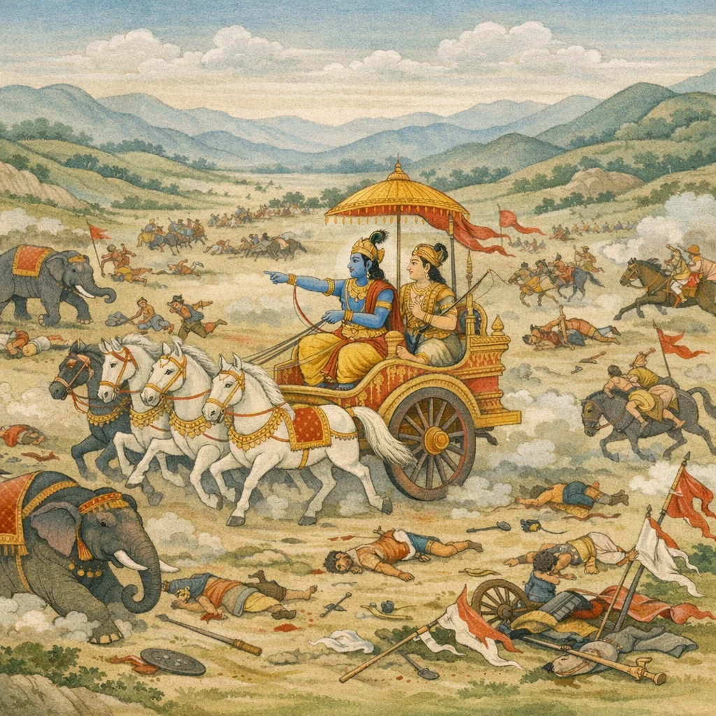 Sañjaya said: “Behold the horses lying in many places, drenched in blood. See also the anukarṣas and upāsaṅgas (the trailing and attached fittings of chariots), the banners and the many kinds of standards—scattered about in the ruin of battle.” In this report, the narrator does not glorify violence; he forces the listener to confront the moral weight of war through its concrete aftermath—broken equipment, fallen animals, and the disordered symbols of martial pride.