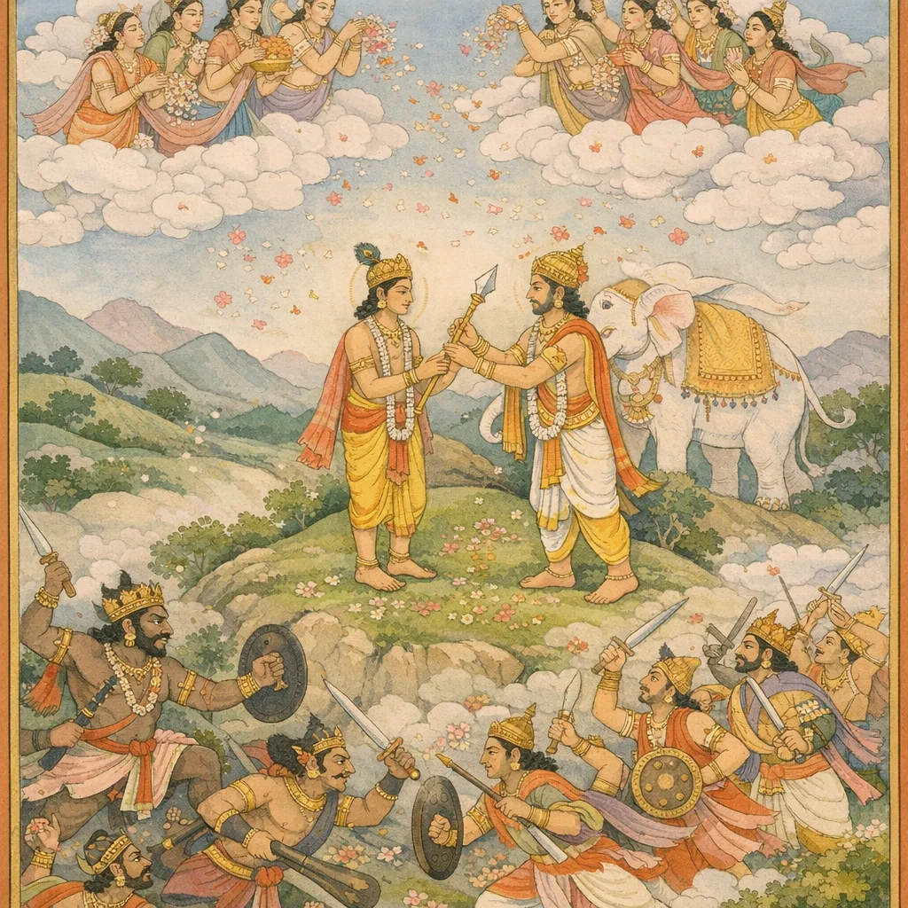 Vaiśampāyana said: Honoured in the assembly by the gods, he attained supreme joy. Thereafter the blessed god Skanda—having destroyed the enemies of the gods—was attended upon by the deities and became exceedingly delighted. Then, O king, the kettledrums resounded, and the conch too, O Bhārata. Ethically, the passage frames victory as the restoration of divine order: the defeat of those who oppose the gods is followed not by arrogance but by communal recognition, service, and the ritual sounds that mark a re-established harmony.