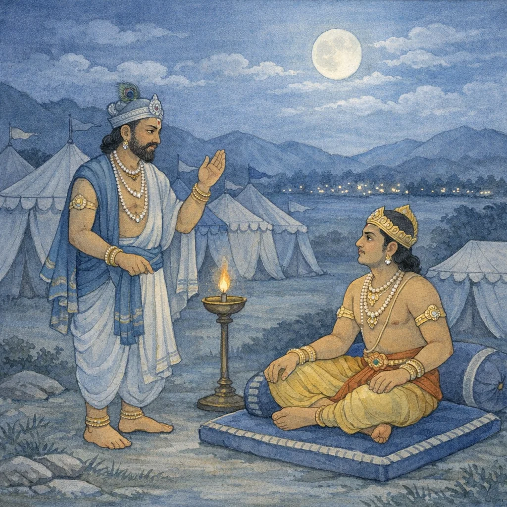 सुष्वाप रजनीं तां तु विशल्य इव कुञ्जर: । श्रीकृष्णके चले जानेपर उस समय धर्मपुत्र युधिष्ठिरने अपने सब भाइयों तथा पांचालों और सोमकोंको भी विदा करके रातमें अंकुशरहित हाथीके समान शयन किया ।। ते च सर्वे महेष्वासा: पञ्चाला: पाण्डवास्तथा,इति सत्य ब्रवीम्येष दुर्योधन न संशय: । “मैं रणभूमिमें कुन्तीके सभी पुत्रों और सामने आये हुए सोमकोंपर भी विजय प्राप्त कर लूँगा। इसमें भी संदेह नहीं कि मैं तुम्हारा सेनापति होऊँगा और ऐसे व्यूहका निर्माण करूँगा, जिसे शत्रु लाँघ नहीं सकेंगे। दुर्योधन! यह मैं तुमसे सच्ची बात कहता हूँ। इसमें कोई संशय नहीं है”