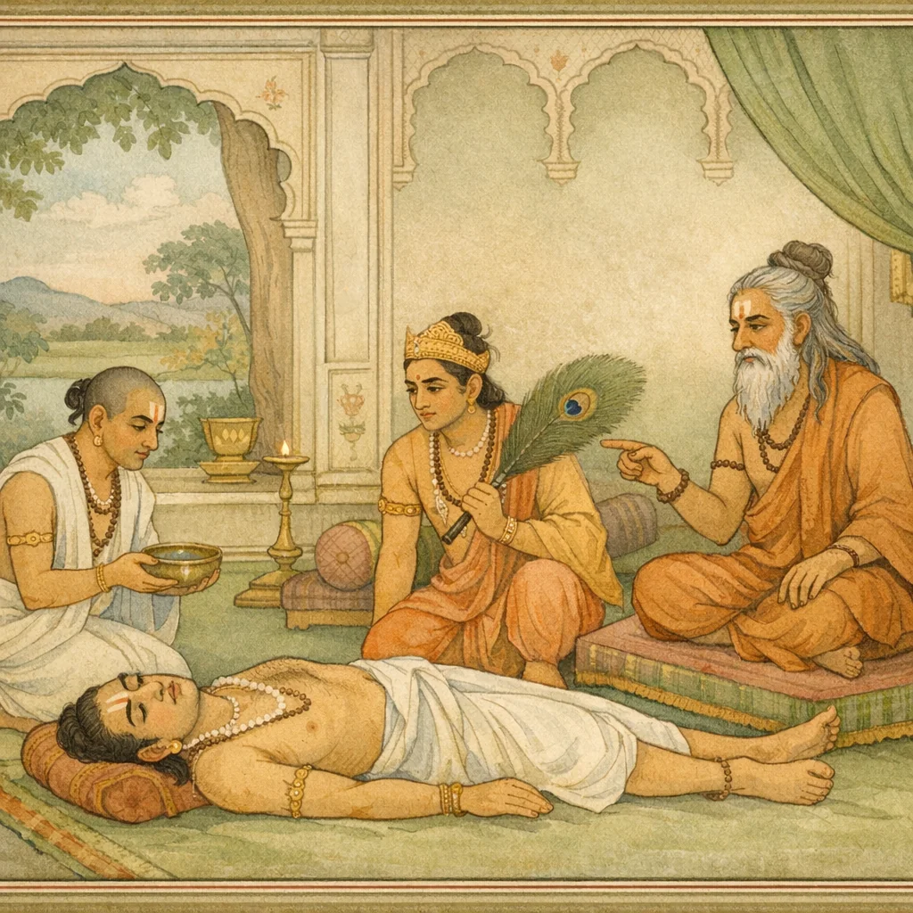 Chapter Arc: कुरुक्षेत्र-विनाश के बाद धृतराष्ट्र शोक से मूर्छित होकर भूमि पर गिर पड़ते हैं; सभा में उपस्थित बान्धव, विदुर, संजय और द्वारस्थ जन शीतल जल व तालवृन्तों से उन्हें होश में लाने का यत्न करते हैं। → होश में आते ही धृतराष्ट्र का पुत्र-शोक दावानल की भाँति भड़क उठता है; तब कृष्णद्वैपायन व्यास उन्हें यह स्मरण कराते हैं कि यह संहार अवश्यम्भावी था और इसके मूल में दुर्योधन का कलि-स्वरूप, अमर्षशील स्वभाव तथा आत्मापराध निहित है। → व्यास का कठोर-करुण उपदेश—‘तुम्हारे पुत्र अपने ही अपराध से विनष्ट हुए; शोक का कारण नहीं’—धृतराष्ट्र के भीतर उठती ज्वाला पर प्रज्ञा-जल छिड़कता है, और संहार के दैवी-नियोजन (देवर्षि नारद आदि की उपस्थिति, पृथ्वी का भार-हरण) का व्यापक दृश्य उद्घाटित होता है। → धृतराष्ट्र को शोक-निवृत्ति और विवेक की ओर मोड़ा जाता है: पुत्र-शोक को अग्नि मानकर उसे बुद्धि-जल से शांत करने का आग्रह होता है; युद्ध को ‘भार-नाश’ हेतु घटित दैवी-कार्य के रूप में समझाया जाता है। → व्यास के संकेतों से आगे की दिशा बनती है—पृथ्वी-भार-हरण के निमित्त देव-योजना पूर्ण हो चुकी; अब शेष पात्रों को अपने-अपने लोक/स्थान की ओर लौटने और शोक के बीच आगे के कर्म (अंत्येष्टि, स्त्रियों का विलाप, उत्तरकृत्य) की ओर बढ़ना है।