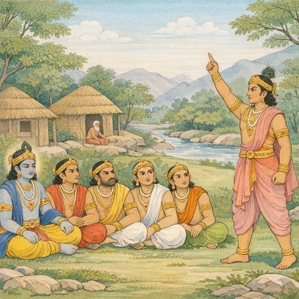 Chapter Arc: वन-निर्वासन में पड़े पाण्डवों की ओर मित्र-राजाओं का क्रोध और करुणा एक साथ उमड़ पड़ते हैं; वे अधर्म से छीने गये राज्य का समाचार सुनकर वन में उन्हें देखने निकल पड़ते हैं। → धृष्टद्युम्न, धृष्टकेतु और केकय-वीर पाण्डवों के दुःख से क्षुब्ध होकर धृतराष्ट्र-पुत्रों की निन्दा करते हैं और प्रतिशोध/युद्ध का आग्रह उठाते हैं—‘अब क्या किया जाये?’ यह प्रश्न सभा-सा बनकर वन में गूँजता है। → धृष्टद्युम्न का उग्र संकल्प—रामकृष्ण (बलराम-कृष्ण) के आश्रय से अजेय होकर द्रोण-वध, शिखण्डी द्वारा भीष्म-निग्रह आदि भविष्य-युद्ध की प्रतिज्ञाएँ—और उसी क्षण केशव का मध्यस्थ वचन, जो आवेग को नीति में ढाल देता है। → केशव मित्रों के उत्साह को संयमित कर पाण्डवों के दीर्घ-धैर्य, समय-पालन और धर्मसम्मत प्रतिकार की दिशा दिखाते हैं; वन-जीवन की कठोरता, तप, और पूर्व-घटनाओं (भीम का विष-प्रसंग, राक्षस-वध, वामन-त्रिविक्रम आदि) के स्मरण से पाण्डवों की रक्षा-रेखा और भाग्य-रेखा स्पष्ट होती है। → मित्र-राजाओं का युद्धोन्माद शांत तो होता है, पर प्रतिज्ञाओं की ज्वाला भीतर सुलगती रहती है—आगामी समय में यही संकल्प कुरुक्षेत्र की ओर कैसे बढ़ेगा?