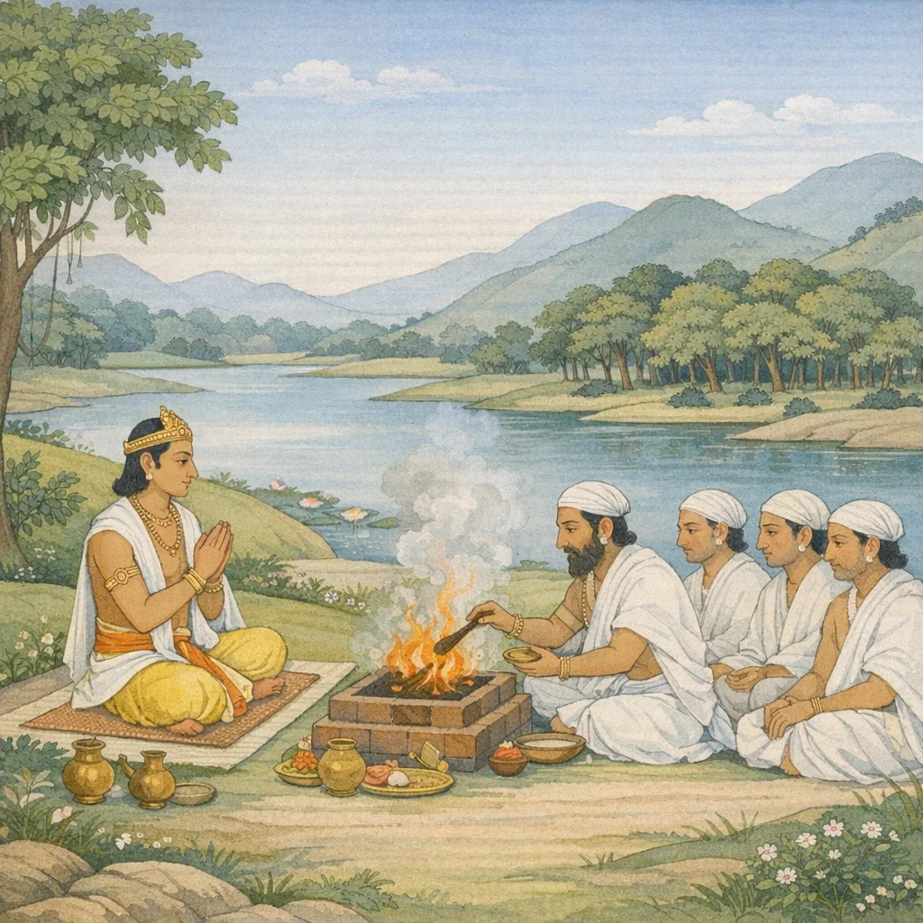 Lomaśa said: “Ambarīṣa and Nābhāga performed a sacrificial rite along the Yamunā. There, after completing the sacrifice, he distributed ten lotus(-like) gifts to the assembled officiants and participants. The passage highlights the dharmic ideal that sacrifice is fulfilled not merely by ritual, but by generous, orderly giving to those who uphold the rite.”