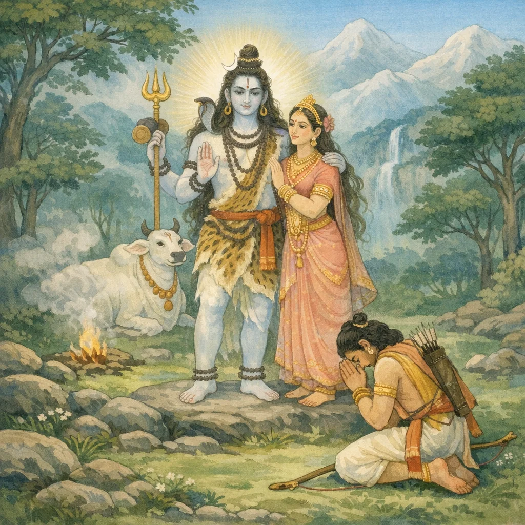 Then the Blessed Lord, whose banner bears the bull, became visible in person—accompanied by Umā, adorned with serpents, and holding the bow Pināka. The many-formed Lord, the wielder of the trident, came near me on that battlefield, stood before me as before, and said: “O scorcher of foes, I am pleased with you.”