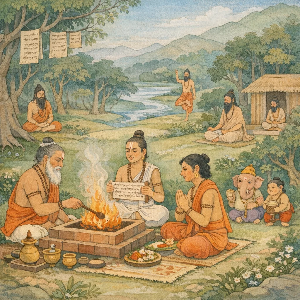 Chapter Arc: मार्कण्डेय ऋषि यज्ञ-विद्या के एक सूक्ष्म रहस्य का द्वार खोलते हैं—श्रुति-वाक्य के अनुसार अग्नि और सोम को ‘उपांशु’ (मन्द/गुप्त) मन्त्रोच्चारण के साथ आज्यभाग अर्पित करने का विधान, और उसके पीछे छिपा कारण। → आंगिरस-वंशी तपस्वी पुत्र-प्राप्ति हेतु दीर्घकाल तक तीव्र तप करते हैं—ऐसा पुत्र चाहिये जो ब्रह्मा के समान यशस्वी और धर्मिष्ठ हो। पर यज्ञ-मार्ग में विघ्न खड़े होते हैं: विनायक-गण हवि का अपहरण करते, अग्नियों के भाग में बाधा डालते और यज्ञ को अस्थिर कर देते हैं। → सृष्टि-रहस्य का विस्फोटक वर्णन—देव-तत्त्वों/अग्नि-स्वरूपों की उत्पत्ति और साम-स्वरों (बृहत्, रथन्तर) का प्राकट्य; साथ ही यह निर्णायक संकेत कि चिताग्नि (संस्कारित, प्रज्वलित अग्नि) और मन्त्र-शक्ति ही विघ्नकारियों को रोकने का वास्तविक अस्त्र है। → यज्ञ-निपुण विद्वान बाह्य वेदी पर विनायकों के लिये ‘तदादान’ (उचित अर्पण/प्रबन्ध) करते हैं ताकि वे मुख्य अग्नि के समीप न आयें; मन्त्रों से शान्त की गयी अग्नि यज्ञ-भाग की रक्षा करती है। अंततः हवि-विभाग का नियम स्थिर होता है और तपस्वी/यजमान परम प्रसन्नता पाते हैं। → आंगिरसोपाख्यान की धारा आगे बढ़ती है—यज्ञ-रक्षा के इस विधान के बाद पुत्र-प्राप्ति/फल-प्राप्ति का अगला चरण किस रूप में प्रकट होगा?