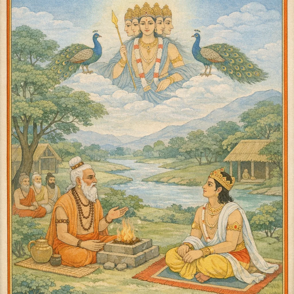 Chapter Arc: युधिष्ठिर के प्रश्न-प्रसंग में, ऋषियों की सभा के बीच महातपा मार्कण्डेय स्कन्द के जन्म-वृत्तान्त की कड़ी को आगे बढ़ाते हुए अचानक देवसेनापति के अनेक नामों का उद्घोष करते हैं—मानो एक ही देवता में असंख्य तेजों का समाहार हो। → नाम-गणना साधारण परिचय नहीं रहती; वह स्तुति में बदलती जाती है—स्कन्द को ‘महिषार्दन’, ‘भूतेश’, ‘षण्मुख’, ‘शरवणोद्धव’, ‘ब्रह्मचारी’, ‘शत्रुजेता’ कहकर उनके विराट् रूप, युद्ध-शक्ति और तप-चर्या को एक साथ बाँधा जाता है। श्रोता के मन में प्रश्न उठता है: यह देवता केवल युद्ध-नायक है या धर्म-रक्षक भी? → स्तुति का शिखर तब आता है जब स्कन्द को सर्वव्यापी सेनाधिपति और विश्व-धारणकर्ता के रूप में संबोधित किया जाता है—‘त्वमेव सेनाधिपतिः… सहस्रभूस्त्वं धरणी त्वमेव…’ तथा ‘षण्मुख’ के बहुरूपी, कुक्कुट-खेल, और देव-तत्त्वों (सोम, मरुत, वायु, इन्द्र) से उनकी एकात्मता का घोष होता है। → मार्कण्डेय स्तुति को ‘फलश्रुति’ में बाँध देते हैं—जो द्विज एकाग्रचित्त होकर स्कन्द के जन्म-वृत्तान्त/स्तव का पाठ, श्रवण या श्रावण करता है, उसे धन, आयु, यश, पुत्र, शत्रुजय, पुष्टि-तुष्टि और अंततः ‘स्कन्द-सालोक्य’ की प्राप्ति होती है।