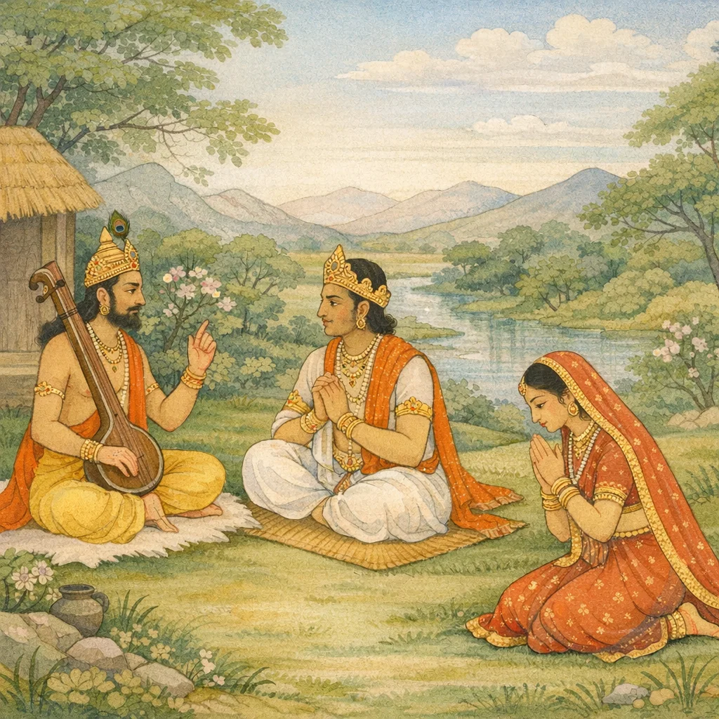 Chapter Arc: तीर्थों और आश्रमों का परिभ्रमण कर सावित्री मंत्रियों सहित पिता के भवन लौटती है और वहाँ नारद को पिता के साथ आसनस्थ देखकर दोनों के चरणों में प्रणाम करती है। → राजा अश्वपति सावित्री के विवाह-प्रसंग को आगे बढ़ाते हैं; नारद सत्यवान के कुल, गुण और पृष्ठभूमि का वर्णन करते हुए द्युमत्सेन के राज्य-हरण, अंधत्व और वनवास की कथा सुनाते हैं—जिससे वर-चयन का भार और भी गंभीर हो उठता है। → नारद निर्णायक वाणी बोलते हैं: सत्यवान में केवल एक ही दोष है—आज से एक वर्ष के भीतर उसकी आयु समाप्त हो जाएगी और वह देह-त्याग करेगा। → नारद सावित्री के विवाह में अविघ्न की शुभकामना देकर विदा लेते हैं; प्रसंग का केंद्र अब ‘निश्चित मृत्यु’ के ज्ञान के साथ सावित्री के संकल्प और आगामी घटनाओं की ओर मुड़ जाता है। → सत्यवान की एक-वर्ष-सीमा निश्चित हो चुकी है—अब प्रश्न यह है कि सावित्री इस अनिवार्य नियति के सामने क्या मार्ग चुनेगी और समय के साथ कौन-सा धर्म-निर्णय करेगी।