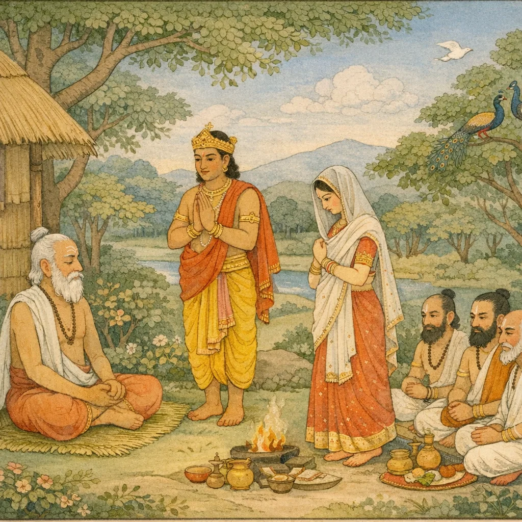 Then, having summoned the aged Brahmins—together with all the officiating priests and the family priest—on an auspicious day he set out for the hermitage-forest, accompanied by the maiden. The passage underscores the ethic of acting under sacred counsel and choosing a propitious time when undertaking a consequential transition in life.