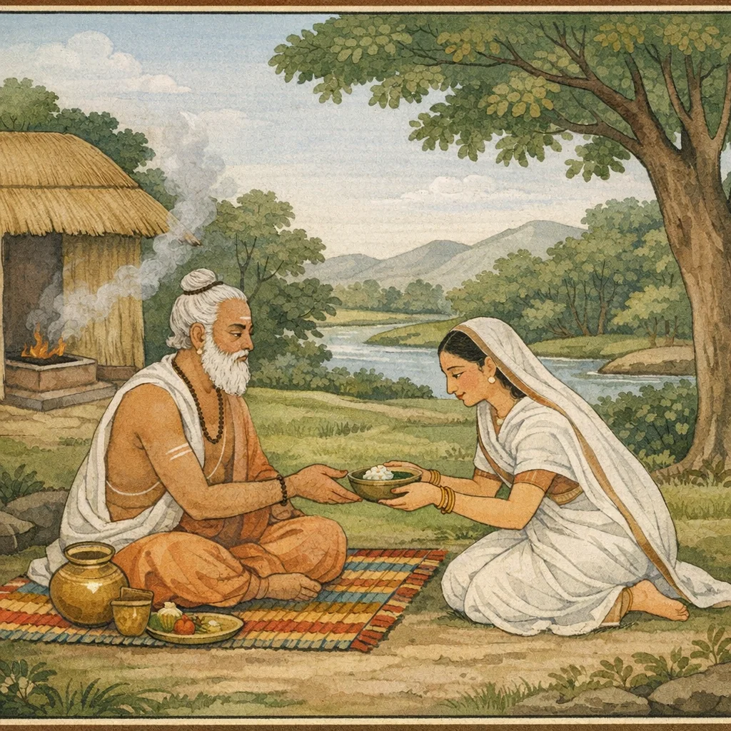 There, Pṛthā (Kuntī)—a virtuous woman devoted to purity—went to the revered brāhmaṇa and, serving him in the prescribed manner as one would serve a deity, kept him fully pleased. The episode underscores an ethic of dharma expressed through disciplined conduct, cleanliness, humility, and reverent service to the worthy.