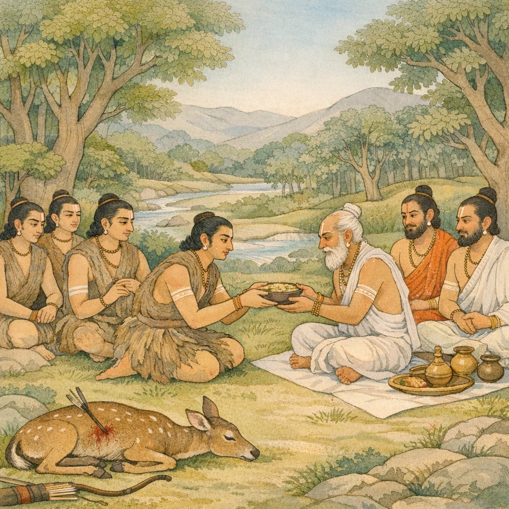 Chapter Arc: जनमेजय, धृतराष्ट्र के शोक और उसके निर्णय की निरर्थकता पर प्रश्न उठाते हुए पूछता है—जिसने पाण्डवों को वन भेजा, वह दुर्योधन जैसे अल्पचेतस पुत्र को कैसे उपेक्षित करता रहा? → प्रश्न का तीखापन बढ़ता है: दुर्योधन ने पाण्डुपुत्रों जैसे महारथियों को क्रुद्ध किया, फिर भी राजा ने उसे त्याग क्यों न दिया? इसी के साथ जिज्ञासा व्यावहारिक धरातल पर उतरती है—वन में पाण्डवों का आहार क्या था, जंगली फल-मूल या खेती का अन्न? → वैशम्पायन का उत्तर: पाण्डव शुद्ध बाणों से वन्य मृगों का शिकार करते, पहले ब्राह्मणों को अग्रभाग निवेदित करते, फिर स्वयं भोजन करते—वनजीवन भी यज्ञ-शिष्टाचार और मर्यादा से बँधा था। → युधिष्ठिर का पालन-पोषणकारी नेतृत्व उभरता है—वह भाइयों को पुत्रवत् स्नेह से पोषित करता; दिशाओं में विभाजित होकर (युधिष्ठिर पूर्व, भीम, यम, आदि) धनुर्धरों सहित नित्य शिकार/आहार-संग्रह करते; काम्यक वन में अर्जुन-वियोग के बीच भी अध्ययन, जप और अभ्यास में वर्षों बीतते हैं। → अर्जुन के बिना बीतते वर्षों और इन्द्रलोकाभिगमन-प्रसंग की छाया के साथ संकेत मिलता है कि आगे तप, दिव्य-प्राप्ति और नियति का बड़ा मोड़ आने वाला है।