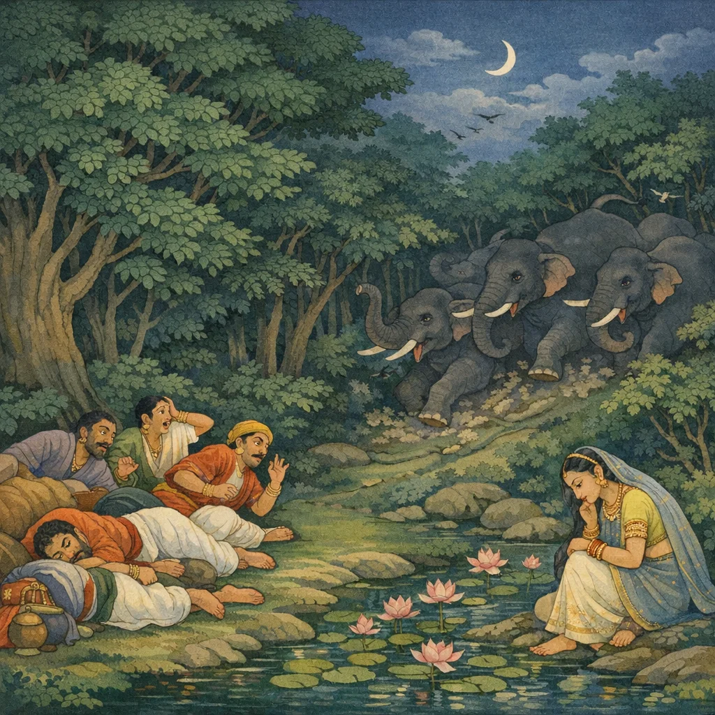 Bṛhadaśva said: Seeking water, a herd of wild elephants came to a mountain river whose stream was muddied by the oozing rut-fluid. Then they saw that caravan—its merchants and, along with them, many elephants as well. The scene underscores how, when vigilance lapses and beings act only from fatigue or instinct, unintended harm can arise in the shared pursuit of basic needs like water.