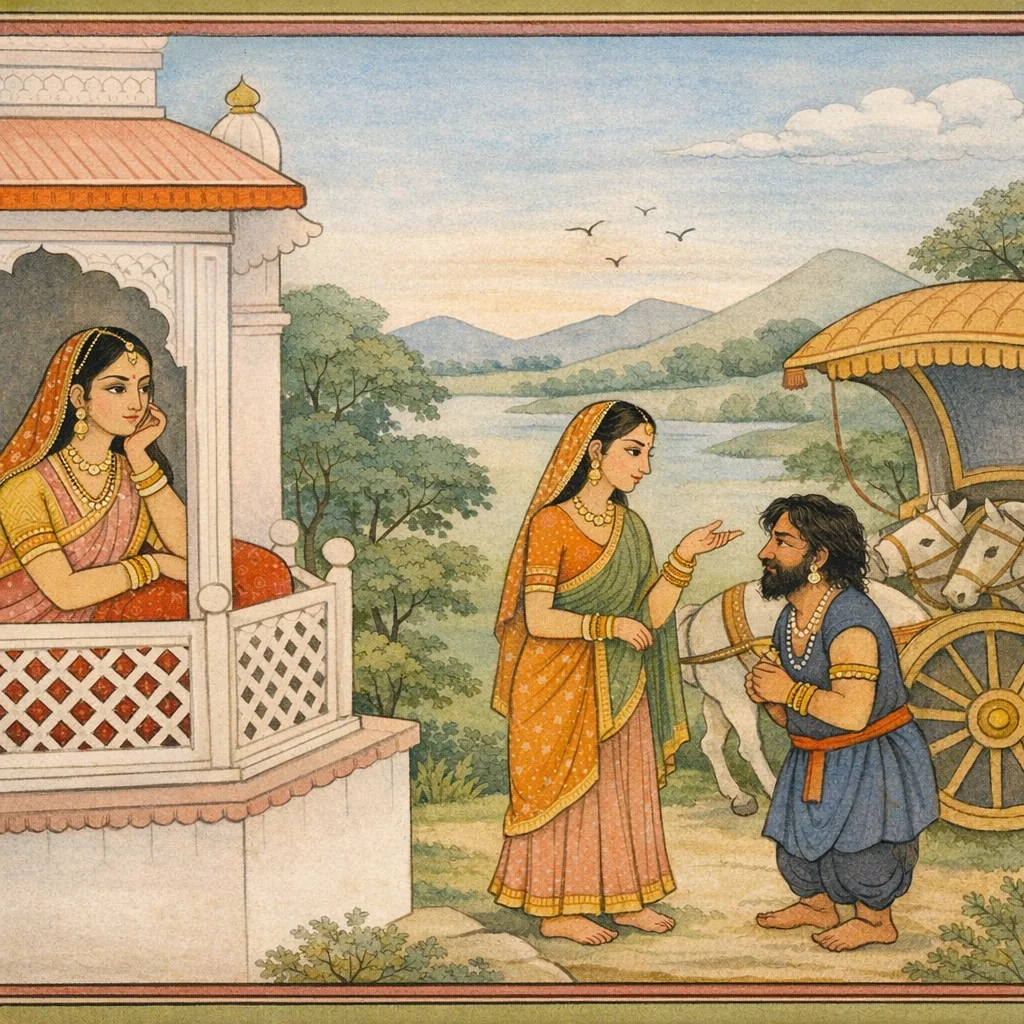 Chapter Arc: दमयन्ती, ऋतुपर्ण के साथ आए विकृत-ह्रस्व ‘बाहुक’ को रथोपस्थ पर उपविष्ट देख, भीतर ही भीतर चौंक उठती है—यह साधारण सारथि नहीं, कहीं नल तो नहीं? वह केशिनी को जाँच के लिए भेजती है। → दमयन्ती केशिनी को सावधानी, मधुर वाणी और यथातत्त्व प्रश्नों का आदेश देती है—अयोध्या से कब चले, क्यों आए, और यह ‘बाहुक’ कौन है। केशिनी बाहुक से संवाद करती है, जबकि दमयन्ती प्रासाद से दूर से ही हर भाव-भंगिमा को परखती रहती है। → दमयन्ती की ‘महती शंका’ तीव्र हो उठती है—बाहुक के उत्तरों, आचरण और भीतर छिपी गरिमा से उसे नल की छाया दिखती है; साथ ही श्लोकों में ‘श्रेष्ठ स्त्री’ का धर्म-संकेत उभरता है: पति राज्यभ्रष्ट, श्रीहीन, क्षुधित और व्यसनाप्लुत हो तब भी पत्नी का कर्तव्य क्या है? → केशिनी लौटकर दमयन्ती को बाहुक के कथन, उसके ‘विकार’ (वेष-परिवर्तन/विकृत रूप) और समस्त संवाद का निवेदन करती है। दमयन्ती के संदेह को ठोस आधार मिलता है, पर पहचान अभी निर्णीत नहीं होती। → दमयन्ती के पास अब संकेत हैं, प्रमाण नहीं—क्या वह बाहुक को नल सिद्ध कर पाएगी, और क्या नल स्वयं अपना आवरण हटाएगा?