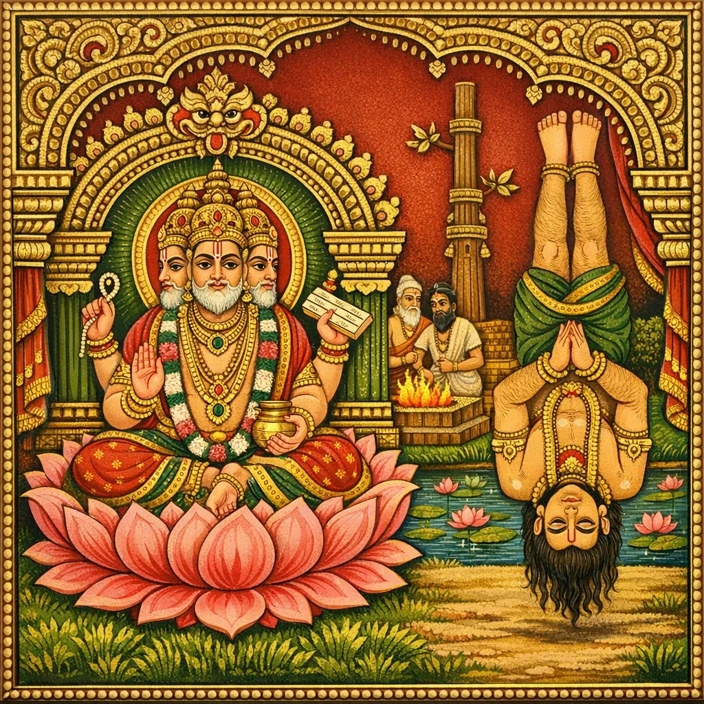 そのダイティヤは十万年のあいだ無食で、頭を下にして耐えた。やがて満足したブラフマーに、恩寵(ヴァラ)を願い求めた。