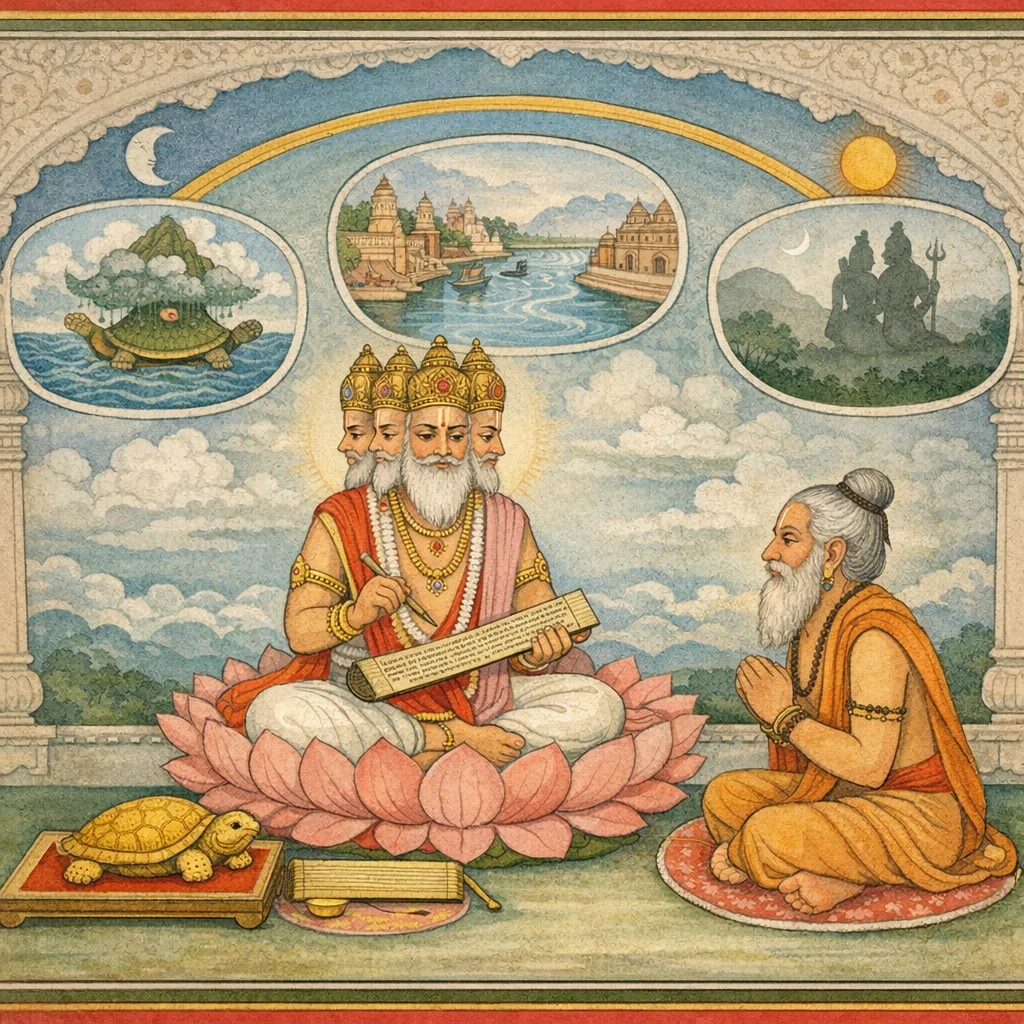 ブラフマーはマリーチに対し、『クールマ・プラーナ』の体系的な梗概を示して教示する。本書はラクシュミー・カルパに従い、ハリ(ヴィシュヌ)の亀形(クールマ)を中心として説かれる。全体は四部・一万七千頌の編纂で、四つのプルシャールタを、ラクシュミーとインドラデュムナの対話やクールマに縁ある聖仙たちの物語など、交錯する叙事によって教えるとされる。内容区分として、ヴァルナ=アーシュラマの行法、宇宙生成、時間計算とプララヤ、遍満の主への讃歌(ストートラ)、さらにシヴァ中心の章(シャンカラ物語、パールヴァティー千名讃、ヨーガ)が列挙される。ブリグ、スヴァーヤンブヴァ・マヌ、カシュヤパ、アートレーヤの系譜、ダクシャ祭祀の破壊と再創、クリシュナの御業、ユガ・ダルマ、ヴィヤーサとジャイミニの論議、ヴァーラーナシーやプラヤーガ等の聖地とヴェーダ諸分派の解説も含まれる。さらに挿入されたギーター(アイシュヴァリー、ヴィヤーサ・ギーター)、ティールタ・マーハートミャ、プラティサルガをブラーフミーヤ・サンヒターとする章、バガヴァティー・サンヒターにおけるヴァルナの生業(サンカラジャに帰される五パーダの解説を含む)、サウリー(太陽)教説、ヴァイシュナヴィー・チャトゥルティーの誓戒が述べられる。末尾は果報の宣説(パラシュルティ)と布施儀礼で締めくくられ、金の亀の印を添えて書写し、アヤナの時に奉納すれば最高の成就に至ると説く。