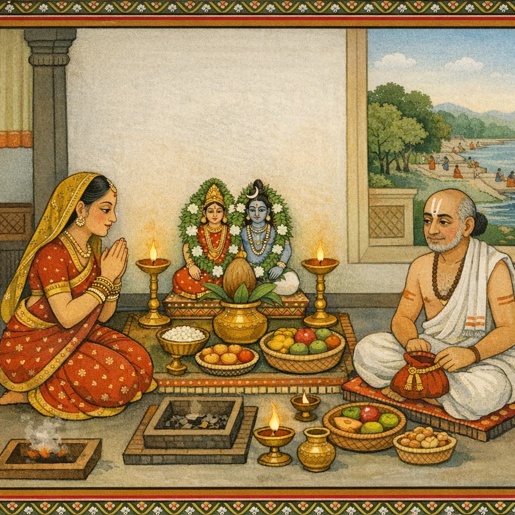 ふさわしき夫を求める乙女、福徳を願う婦人、男子の子を望む者、あるいは夫の安寧を祈る者;また、二度生まれ(ブラーフマナ)の妻として夫と和合する者、もしくは吉相を具えた若き娘—これらは皆、ここに含めてよい。