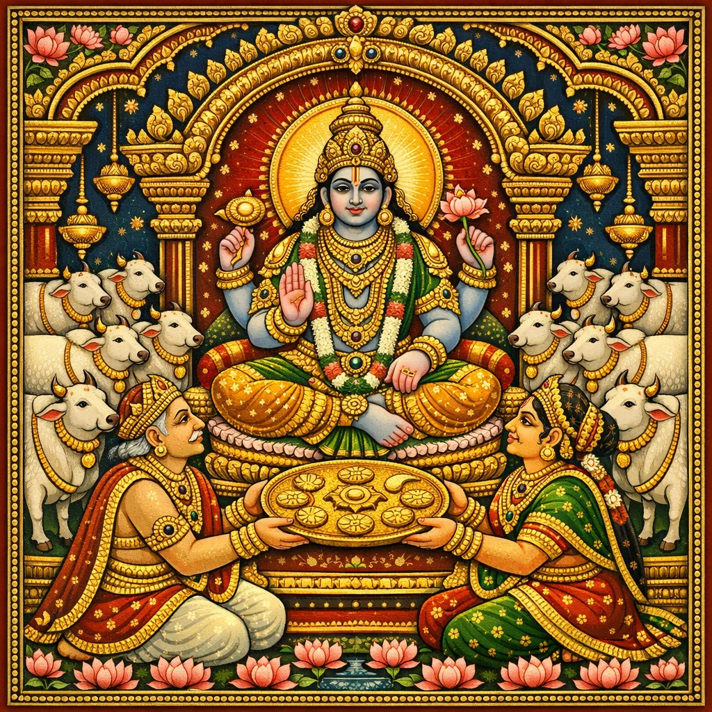 Upon completion of the vow, one should gift ten cows (daśa-dhenu-dāna), making dana the culminating act that externalizes the merit of the observance.