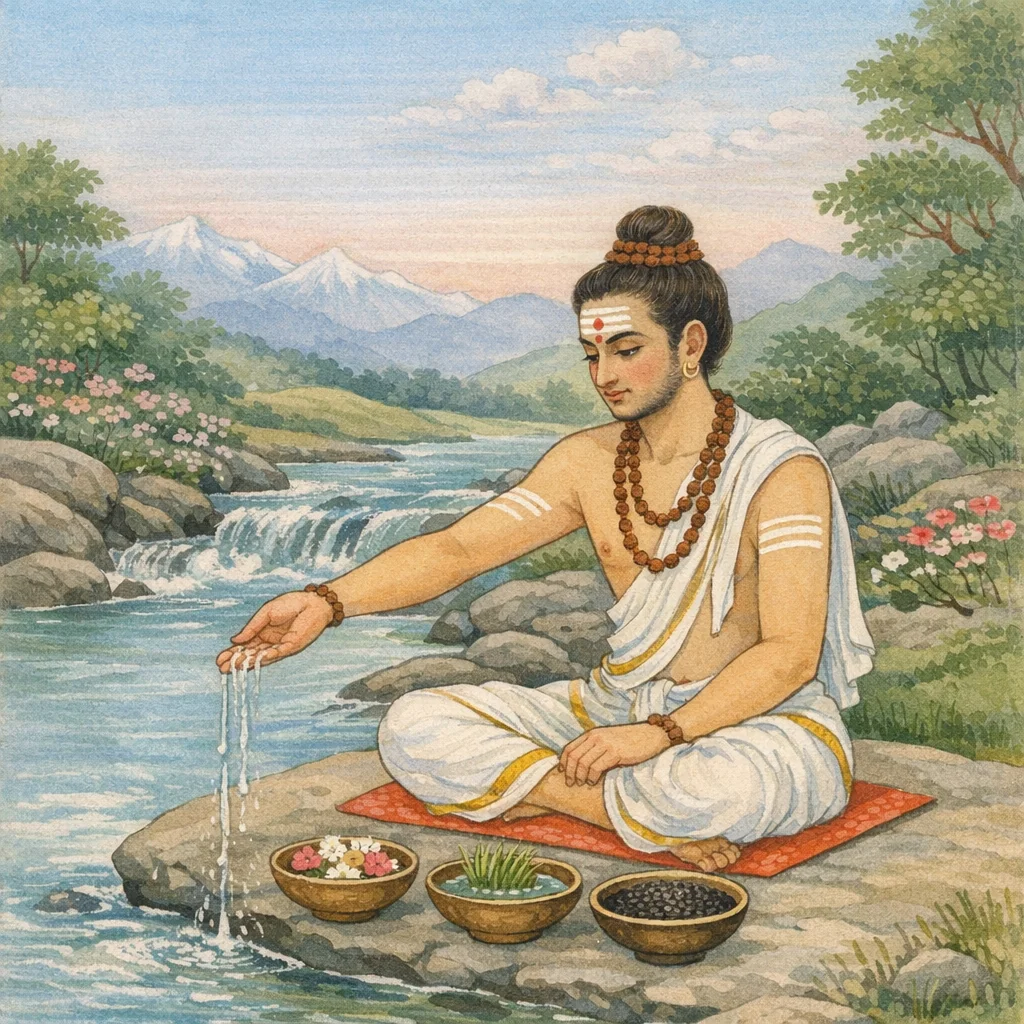សម្រាប់ទេវតា គួរថ្វាយទឹកលាយផ្កា; សម្រាប់ឥសី គួរថ្វាយទឹកដែលបានបរិសុទ្ធដោយស្មៅកុសៈ; និងសម្រាប់បិត្ឫ គួរថ្វាយទឹកលាយគ្រាប់ល្ង—គ្រប់ទីកន្លែងភ្ជាប់ជាមួយក្លិនក្រអូប។ ដូច្នេះ ការបូជាបានពេញលេញ ព្រោះការថ្វាយទាំងអស់ត្រូវបានប្រមូលចូលទៅក្នុងព្រះអម្ចាស់តែមួយ គឺបតិ (ព្រះសិវៈ) តាមពិធីត្រឹមត្រូវ។