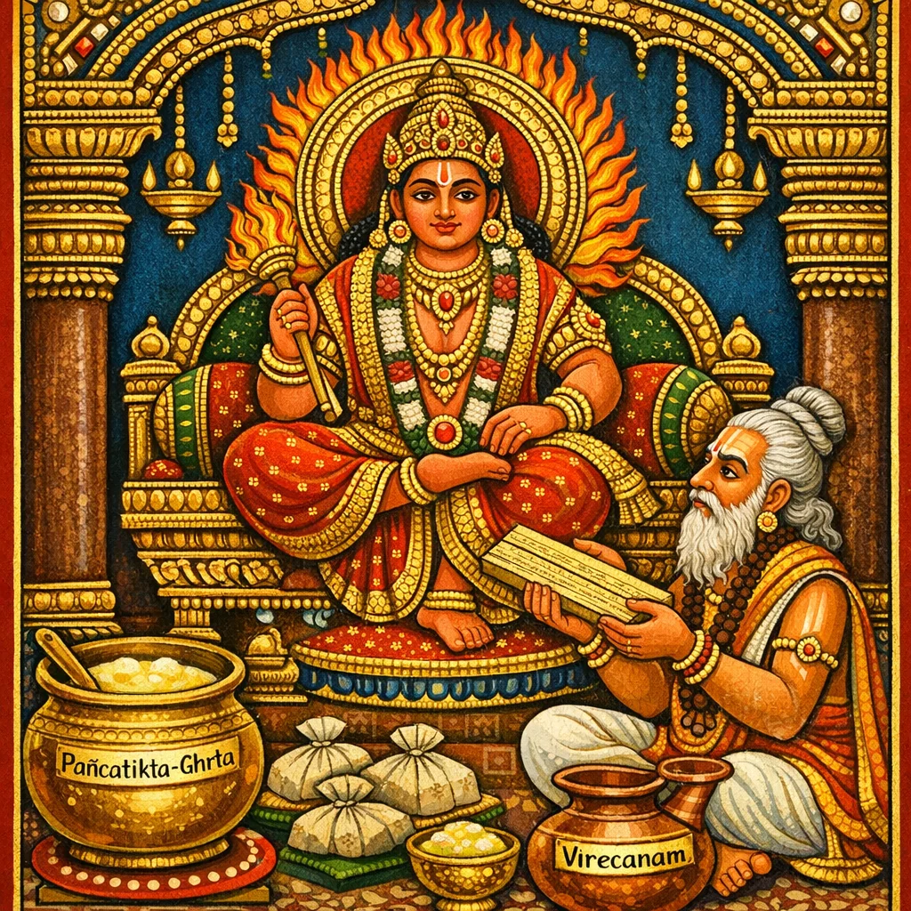 ಅದೇ ರೀತಿಯಾಗಿ ಪಂಚಗವ್ಯದಿಂದ ಸಿದ್ಧವಾದ ಘೃತವನ್ನು ಬಳಸಬೇಕು; ಅದರಲ್ಲಿ ಕುಷ್ಠ (ಕುಷ್ಠನಾಶಕ) ಮತ್ತು ಅಭಯಾ (ಹರೀತಕೀ) ಸೇರಿಸಿ, ಪಟೋಲ, ತ್ರಿಫಲಾ, ನಿಂಬ, ಗುಡೂಚಿ, ಧಾವಣಿ, ವೃಷಗಳನ್ನು ಕೂಡ ಯುಕ್ತಗೊಳಿಸಬೇಕು.