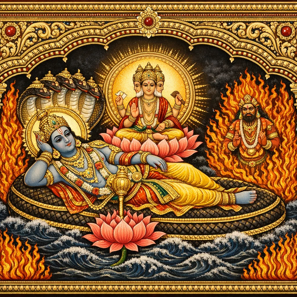ಶೇಷನಾಗನ ಉಸಿರಿನ ಪ್ರಚಂಡ ವೇಗದ ಹೊಡೆತದಿಂದ ಕೆಳಗಿನ ಪಾತಾಳಗಳು ದಹಿಸುತ್ತವೆ; ಪಾತಾಳಗಳಿಂದ ಮುಂದಾಗಿ ವಿಷ್ಣು ಭೂಮಿಯನ್ನು, ಭೂಮಿಯಿಂದ ಮುಂದಾಗಿ ಸ್ವರ್ಗವನ್ನೂ ದಹಿಸುತ್ತಾನೆ।