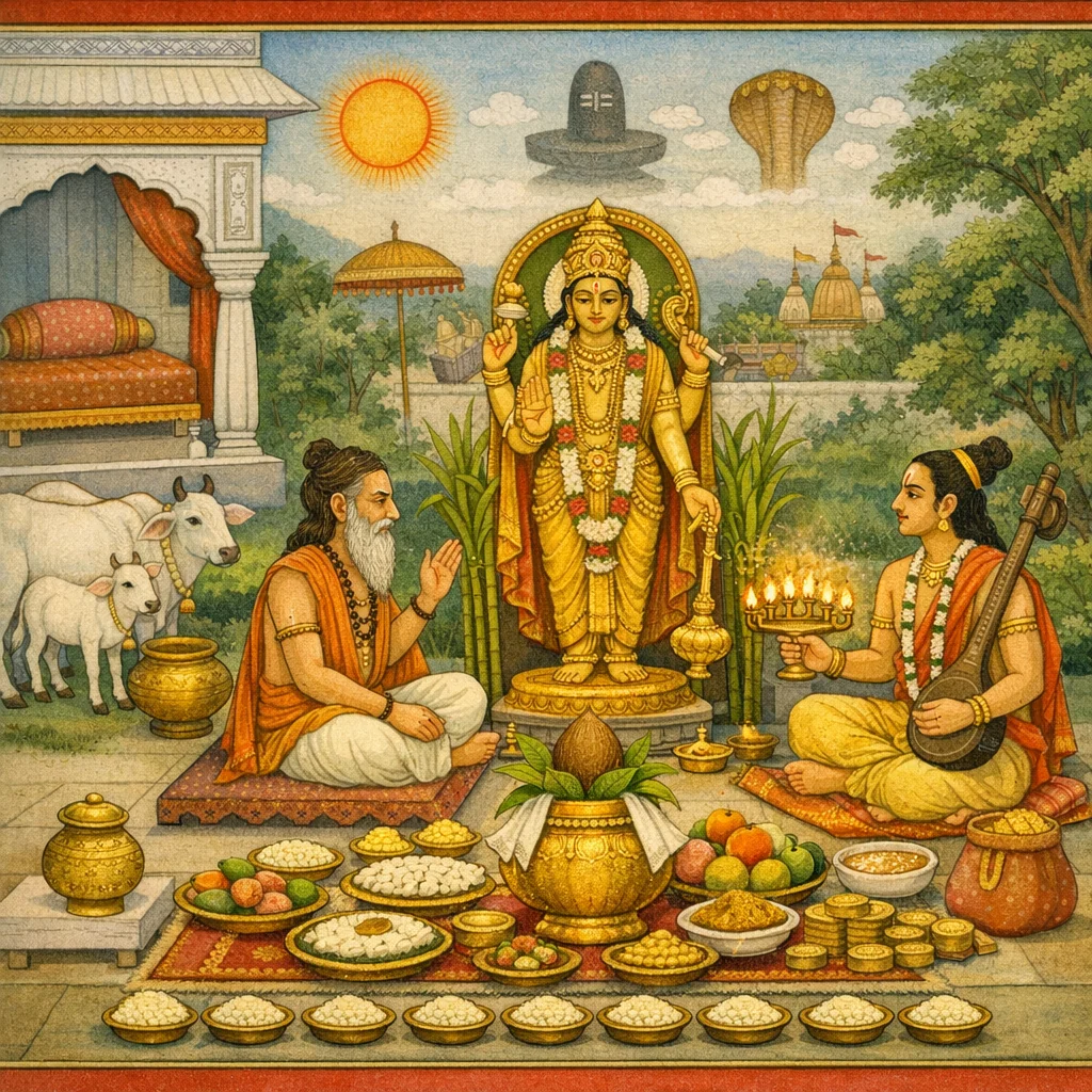 ಆ ಪವಿತ್ರ ಸಂದರ್ಭದಲ್ಲಿ ಜಗತ್ಪತಿ ದೇವ ಪ್ರದ್ಯುಮ್ನನನ್ನು ವಿಧಿವಿಧಾನದಿಂದ ಪೂಜಿಸಬೇಕು; ಅವರು ಪ್ರತ್ಯಕ್ಷವಾಗಿ ಸರ್ವ ಐಶ್ವರ್ಯವನ್ನು ನೀಡಿ ಪುತ್ರ-ಪೌತ್ರವೃದ್ಧಿಯನ್ನು ಉಂಟುಮಾಡುತ್ತಾರೆ।