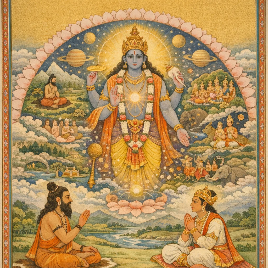 ಭಗವಾನ್ ಹಿರಣ್ಯಗರ್ಭ (ಬ್ರಹ್ಮ), ನಂತರ ವಾಸವ (ಇಂದ್ರ) ಮತ್ತು ಪ್ರಜಾಪತಿ; ಮರುತರು, ವಸುಗಳು, ರುದ್ರರು; ಸೂರ್ಯರು, ನಕ್ಷತ್ರಗಳು, ಗ್ರಹಗಳು—ಇವೆಲ್ಲ ದಿವ್ಯ ವಿಶ್ವಕ್ರಮದ ಅಂಗಗಳು.