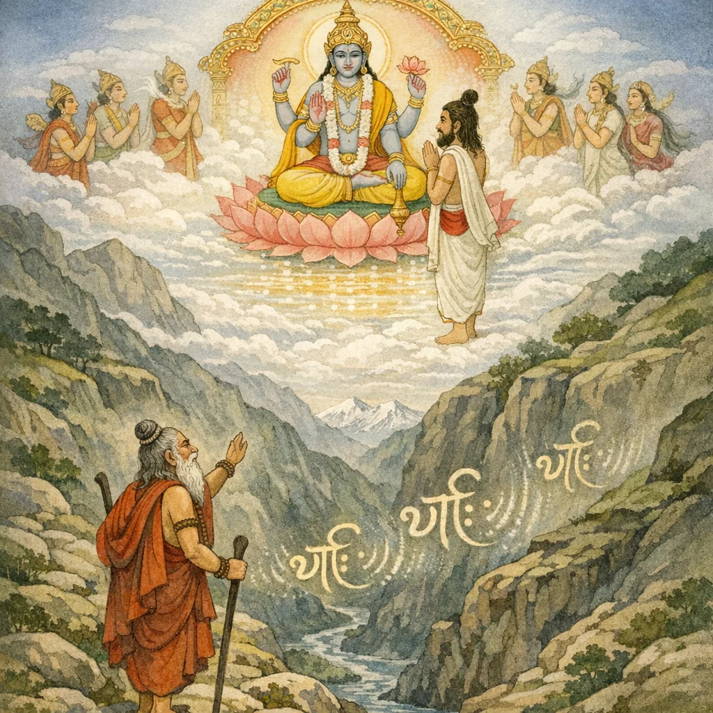 It anchors nirguṇa attainment within a bhakti-compatible vision: the transcendent is approached through a manifest form (conch, discus, mace, lotus), integrating saguṇa worship, avatāra remembrance, and the claim that the Vedas seek Him yet He becomes directly seen by the devotee.