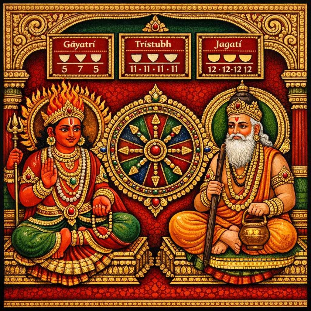 It emphasizes metre-identification and correction: the pāda as the core unit, rules for completing deficient pādas (āpada-pūraṇa), and diagnostic categories for deficiency/excess (avarāṭ/adhika), alongside structured classifications of major metres (Gāyatrī, Uṣṇik, Anuṣṭubh, Triṣṭubh, Jagatī, Vṛhatī).