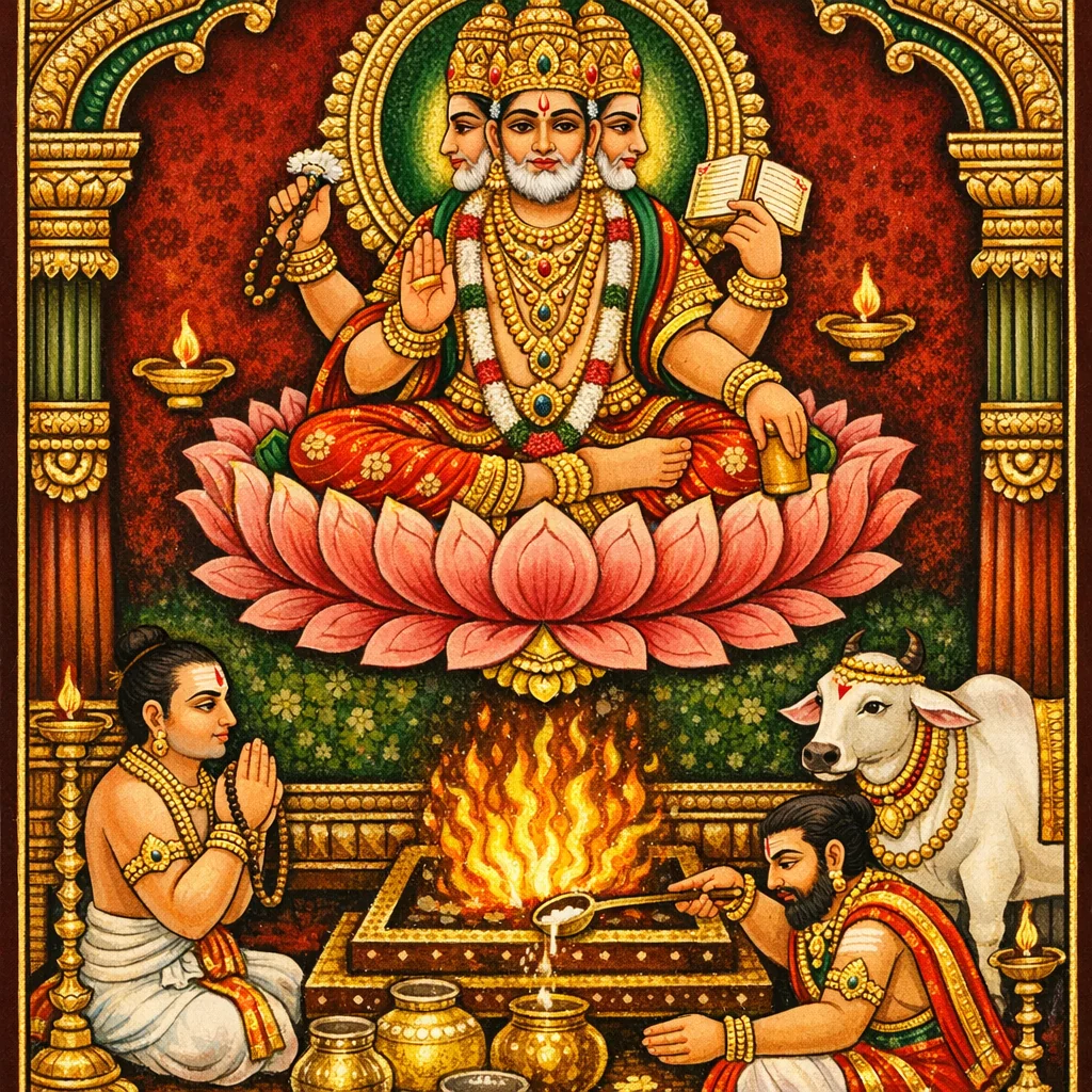 Brahmā is described as golden and matted-haired, with akṣamālā and a ladle (śruva) in the right hand, and a sacrificial ladle (śruc) and kamaṇḍalu in the left, with a long tuft/brush-like emblem (lambakūrca).