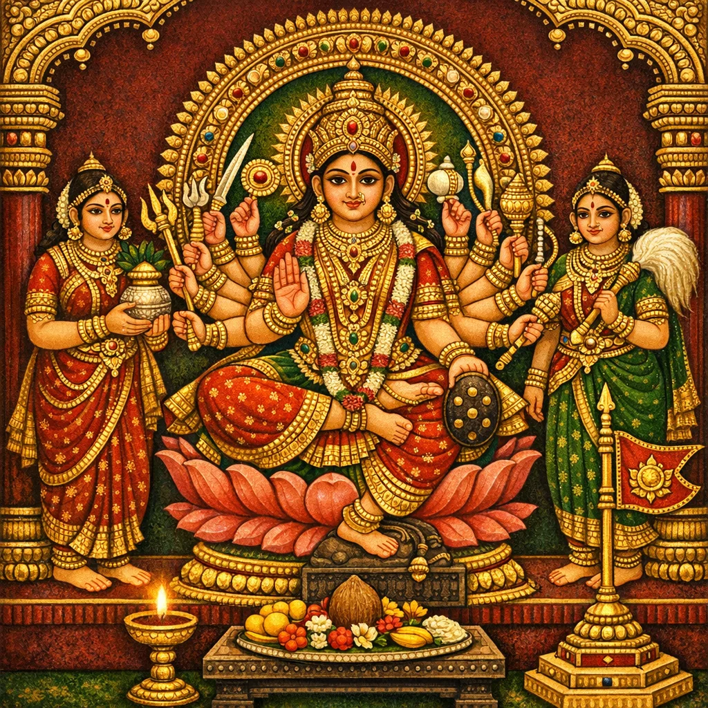 Durgā is visualized in multi-armed forms (notably eighteen-armed and sixteen-handed variants) and associated with a defined set of implements and weapons, which are themselves to be worshipped as part of the observance.