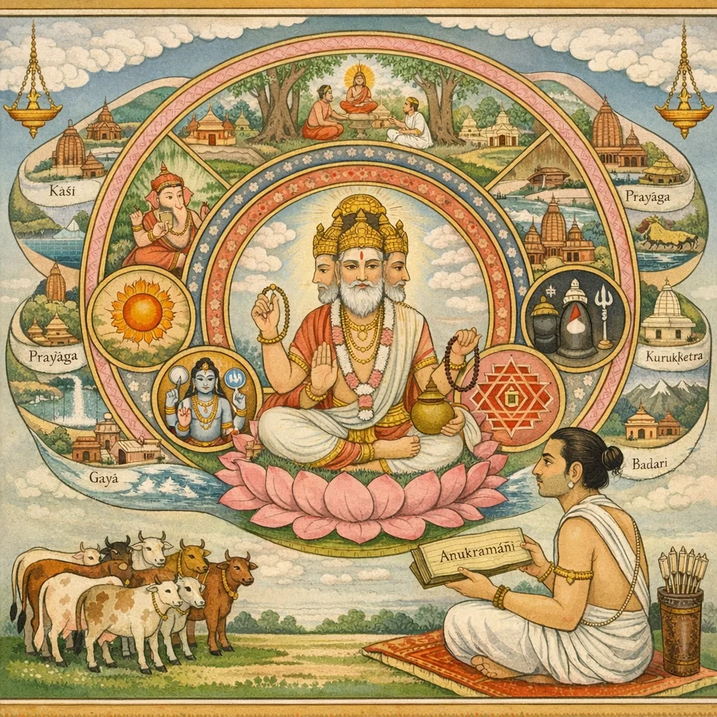 By placing tīrtha-māhātmya and yātrā-vidhi alongside mokṣa-dharma, vrata, and dāna, the Anukramaṇī portrays pilgrimage as a dharma practice that accrues puṇya and supports purification, thereby functioning as an auxiliary path within a broader liberation-oriented framework.
