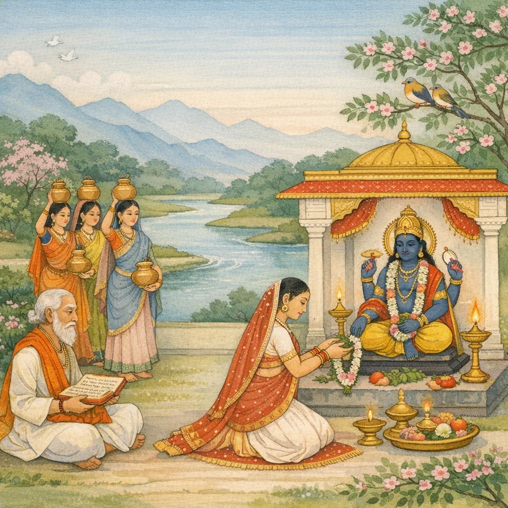 ເມື່ອກະກຽມຫມໍ້ກຸມພະທີ່ເຕັມດ້ວຍທັນຍາພືດເຈັດຊະນິດ ແລະປະດັບດ້ວຍຜ້າ ກິ່ນຫອມ ແລະເຄື່ອງທາແລ້ວ ໂອ ພຣະຜູ້ເປັນເຈົ້າແຫ່ງປະຖະພີ ຈົ່ງຕັ້ງຫມໍ້ເຫຼົ່ານັ້ນໄວ້ເທິງຕົ້ນໄມ້ທັງປວງ।