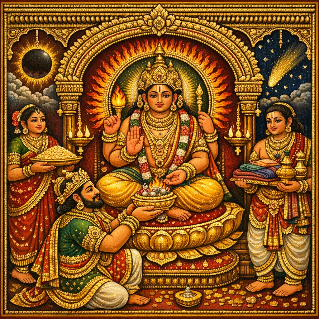 It frames crisis-response as Dharma: calibrated giving and auspicious timing transform fear-inducing portents into disciplined action, supporting social welfare and ritual order while cultivating restraint and merit aligned with Purushārthas.