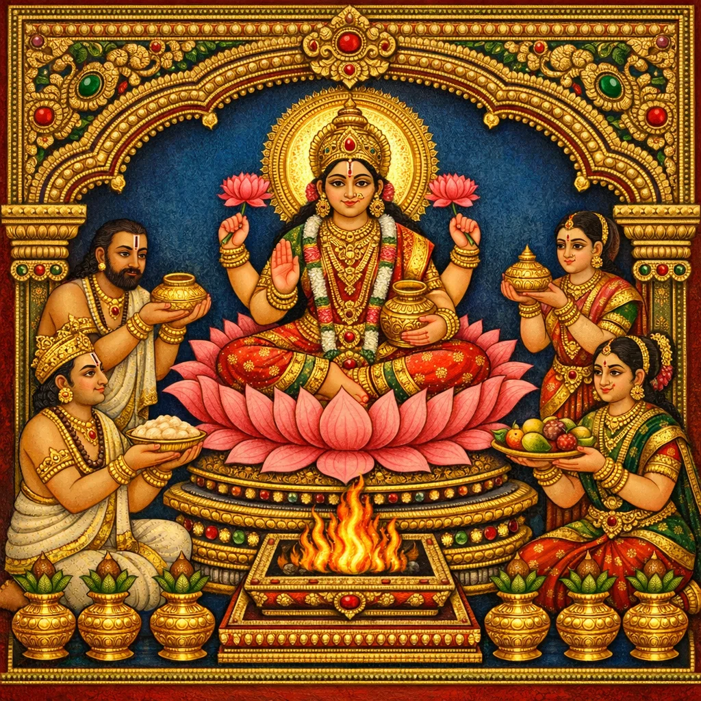 ശ്രീസൂക്തം ജപിച്ചുകൊണ്ട് മണ്ഡപത്തിലെ കുണ്ഡങ്ങളിൽ താമരകൾ ഹോമമായി അർപ്പിക്കണം. അല്ലെങ്കിൽ കരവീര (കണേര) പുഷ്പങ്ങൾ ഹുതം ചെയ്ത്—സഹസ്രമോ കുറഞ്ഞത് ശതമോ—ആഹുതി നൽകണം.