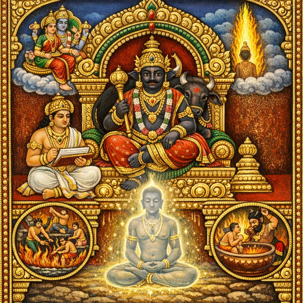 Citragupta operates as Yama’s recorder and administrator of karmic account, guiding the soul’s adjudication that leads either to naraka experiences or to auspicious destinations.