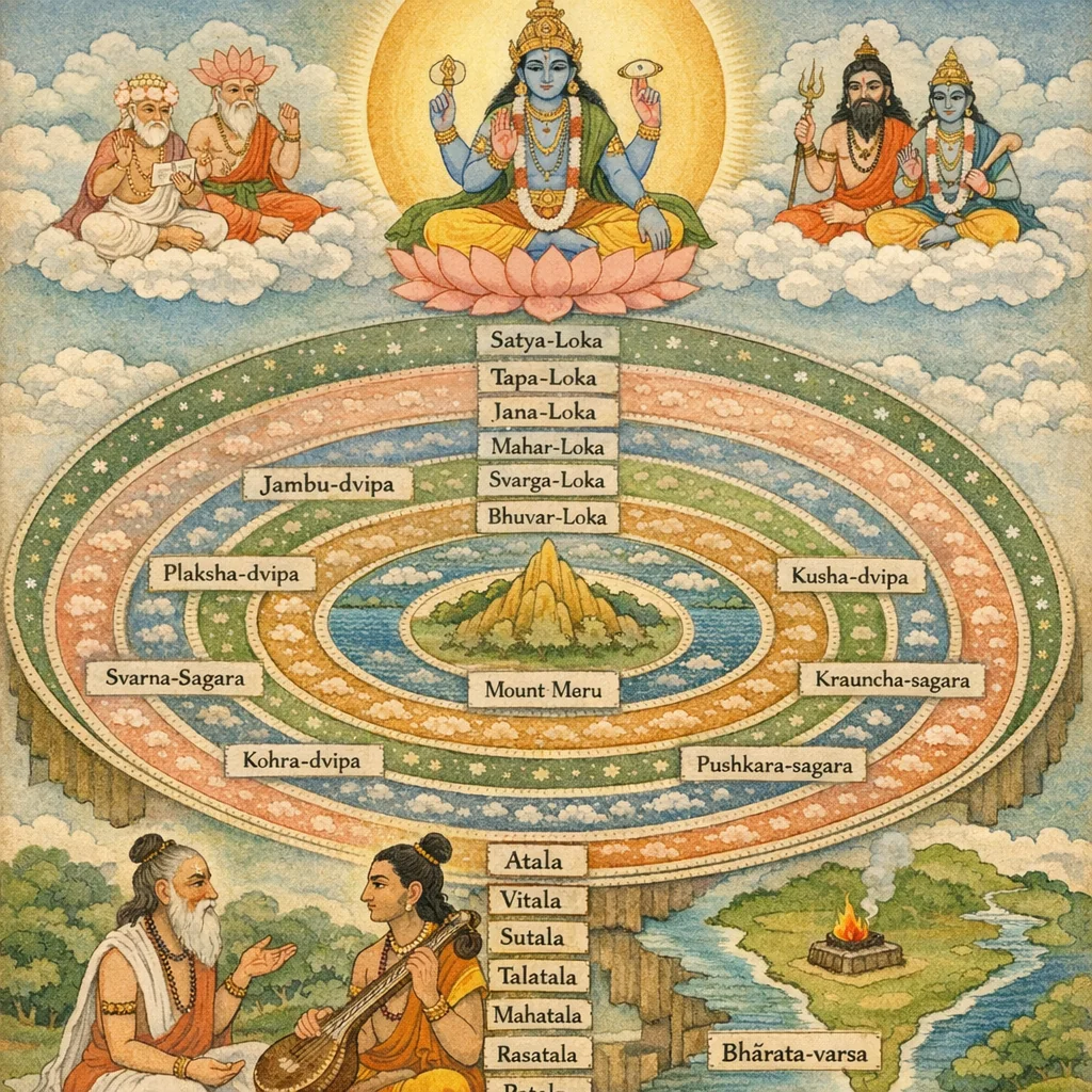 നാരദൻ സനകനോട് ചോദിക്കുന്നു—ആദി സർവ്വവ്യാപിയായ ഭഗവാൻ ബ്രഹ്മാവിനെയും ദേവന്മാരെയും എങ്ങനെ സൃഷ്ടിച്ചു? സനകൻ വിഷ്ണു-കേന്ദ്രിത അദ്വൈതതത്ത്വം പറയുന്നു—നാരായണൻ എല്ലായിടത്തും വ്യാപിച്ചിരിക്കുന്നു; സൃഷ്ടി-സ്ഥിതി-പ്രളയത്തിനായി പ്രജാപതി/ബ്രഹ്മ, രുദ്ര, വിഷ്ണു എന്ന ത്രിരൂപം പ്രത്യക്ഷമാകുന്നു. മായ/ശക്തി വിദ്യയും അവിദ്യയും—ഭേദമായി കരുതുമ്പോൾ ബന്ധനം, അഭേദമായി അറിയുമ്പോൾ മോക്ഷം. തുടർന്ന് സാംഖ്യസദൃശ സൃഷ്ടിക്രമം (പ്രകൃതി–പുരുഷ–കാല; മഹത്, ബുദ്ധി, അഹങ്കാരം; തന്മാത്രകൾ, മഹാഭൂതങ്ങൾ)യും ബ്രഹ്മന്റെ തുടർസൃഷ്ടികളും വിവരിക്കുന്നു. ഏഴ് ഊർദ്ധ്വലോകങ്ങൾ, പാതാളാദി, മേരു, ലോകാലോക, ഏഴ് ദ്വീപങ്ങളും സമുദ്രങ്ങളും, ഭാരതവർഷം കർമഭൂമിയെന്ന നിർണ്ണയവും വരുന്നു. അവസാനം ഭക്തിയും നിഷ്കാമകർമ്മവും മഹത്തായി—എല്ലാ പ്രവൃത്തിയും ഹരി/വാസുദേവനിൽ സമർപ്പിക്കുക, ഭക്തരെ ആദരിക്കുക, നാരായണനും ശിവനും അഭിന്നരെന്ന് കാണുക, വാസുദേവനെക്കാൾ വേറൊന്നുമില്ലെന്ന പ്രഖ്യാപനം।