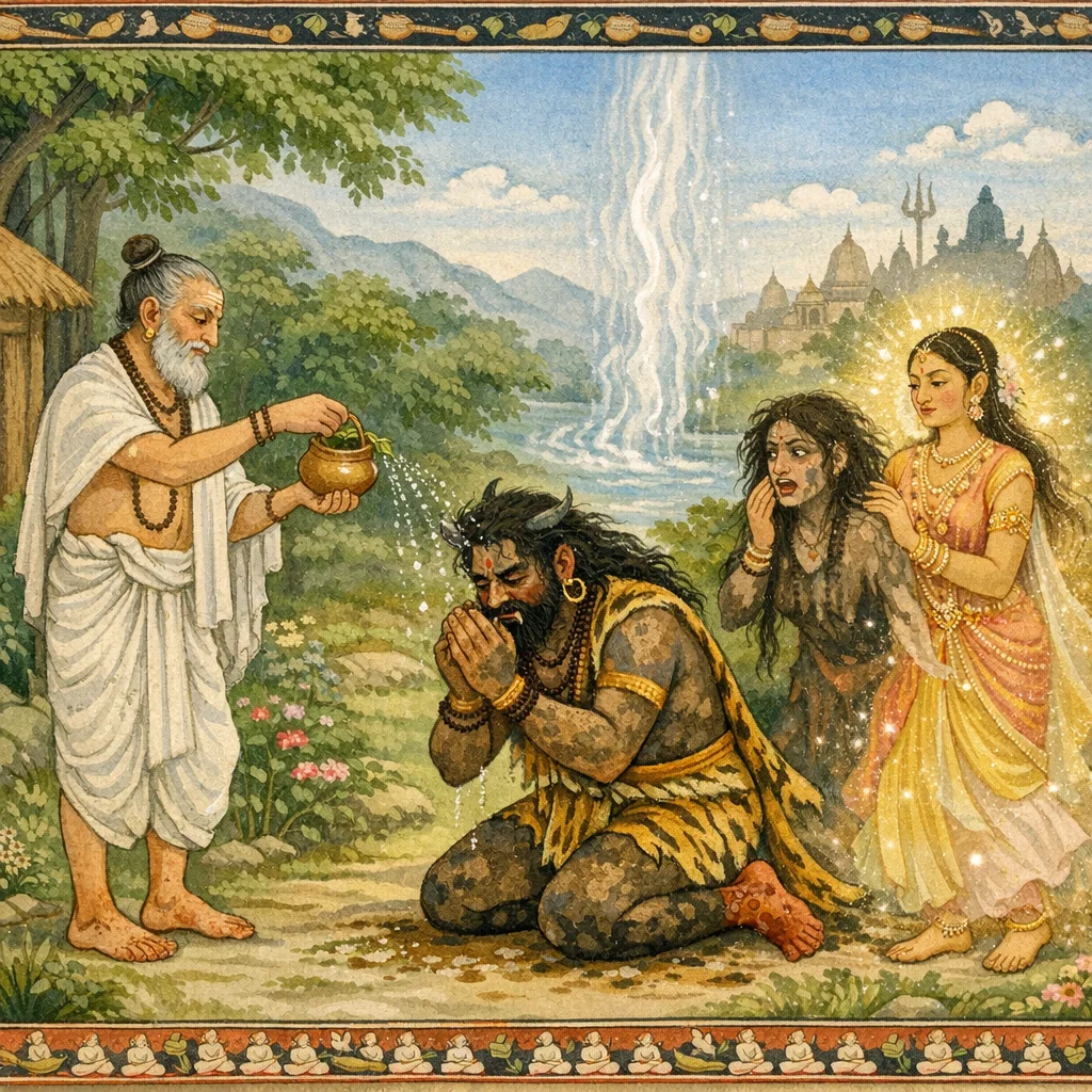 പിന്നീട് കരുണയിൽ ആവിഷ്ടനായ ആ വിപ്രൻ തുളസിദളങ്ങൾ ചേർത്ത അത്യുത്തമമായ ഗംഗാജലം ആ രാക്ഷസന്മാരുടെ മേൽ തളിച്ചു.