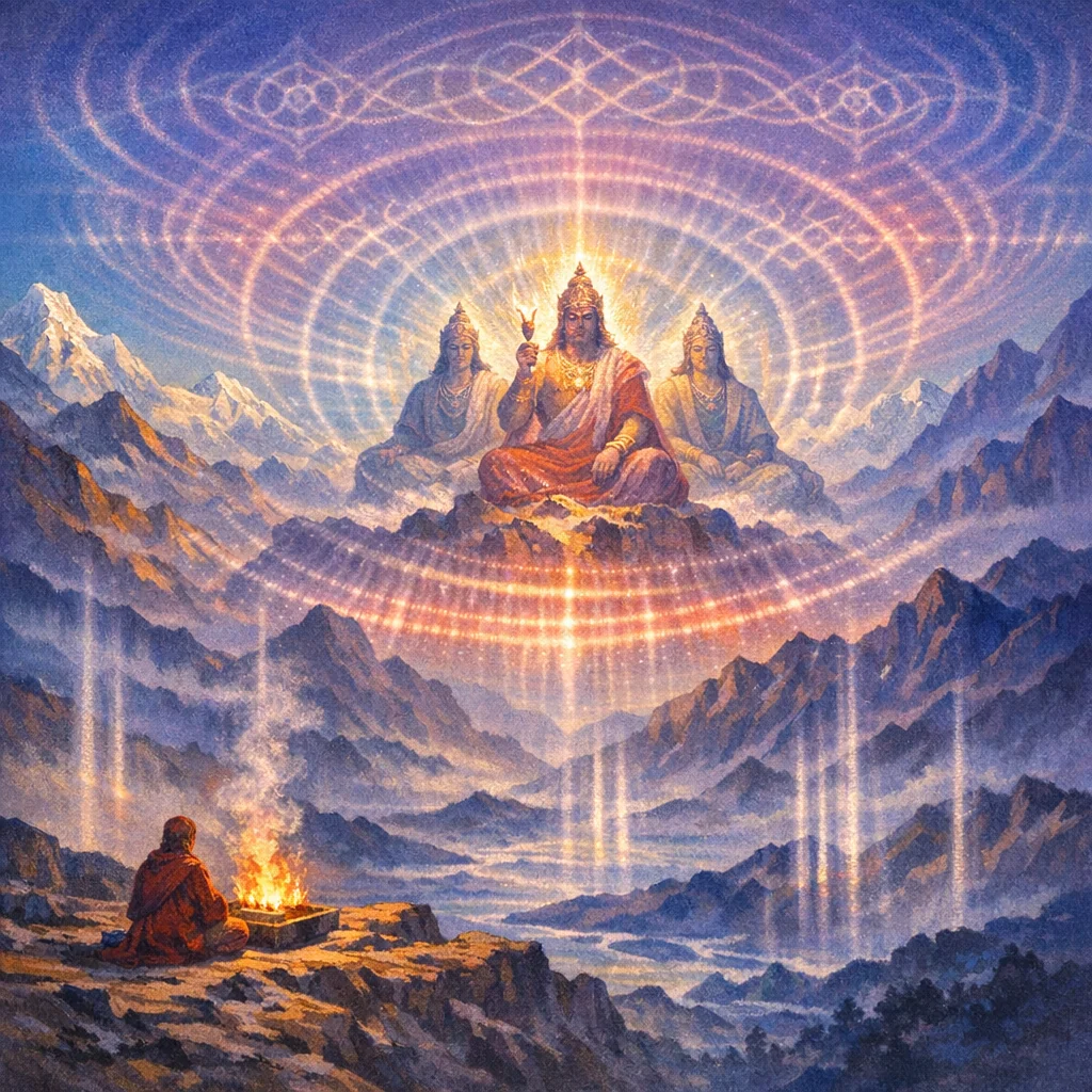 Indra is invoked as praṇetṛ, the one who ‘leads’ the sacrificer through the rite to its fruit; his presence adds decisive strength and assurance to the protection already established by the Ādityas.