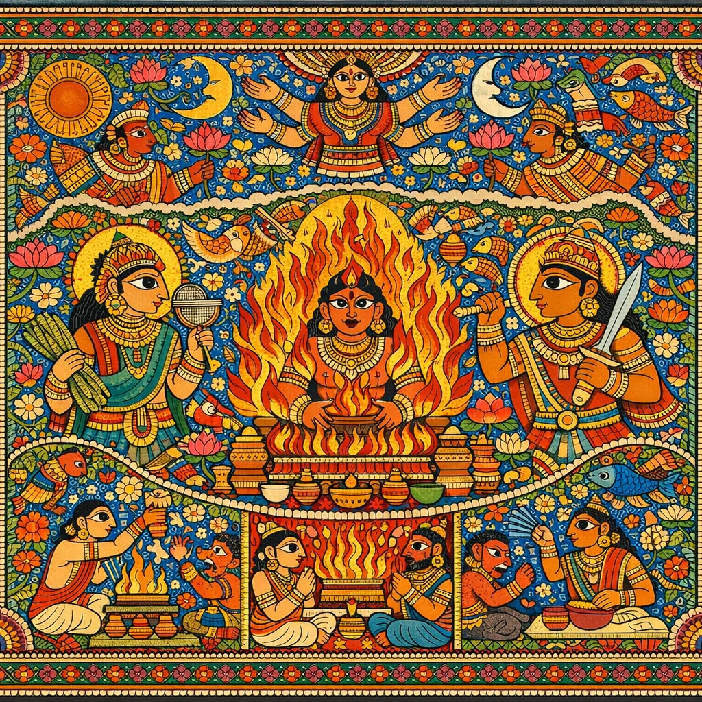 ഹേ അഗ്നേ, ബ്രഹ്മം (പവിത്ര തേജസ്) ഗ്രഹിക്ക; നീ ആധാരമാണ്—അന്തരിക്ഷത്തെ ദൃഢമാക്കുക. ബ്രഹ്മവനി, ക്ഷത്രവനി, സജാതവനി (സ്വജനാധാരത്തെ ജയിക്കുന്നവൻ) എന്ന നിലയിൽ ഞാൻ നിന്നെ പ്രതിസ്പർധി (ഭ്രാതൃവ്യ)യുടെ വധത്തിനായി സ്ഥാപിക്കുന്നു. നീ ധാർത്രമാണ്—ദിവത്തെ ദൃഢമാക്കുക. ബ്രഹ്മവനി, ക്ഷത്രവനി, സജാതവനി എന്ന നിലയിൽ ഞാൻ നിന്നെ ഭ്രാതൃവ്യയുടെ വധത്തിനായി സ്ഥാപിക്കുന്നു. എല്ലാ ദിശകളിൽ നിന്നുമാണ് ഞാൻ നിന്നെ സ്ഥാപിക്കുന്നത്. നിങ്ങൾ ചിത് (ചേതന) ആകുന്നു; ഭൃഗുക്കളുടെയും അങ്ഗിരസുകളുടെയും ഊർധ്വചിത് (ഉന്നതചേതന) ആകുന്നു; തപസാൽ തപസ്സു ചെയ്യുവിൻ.