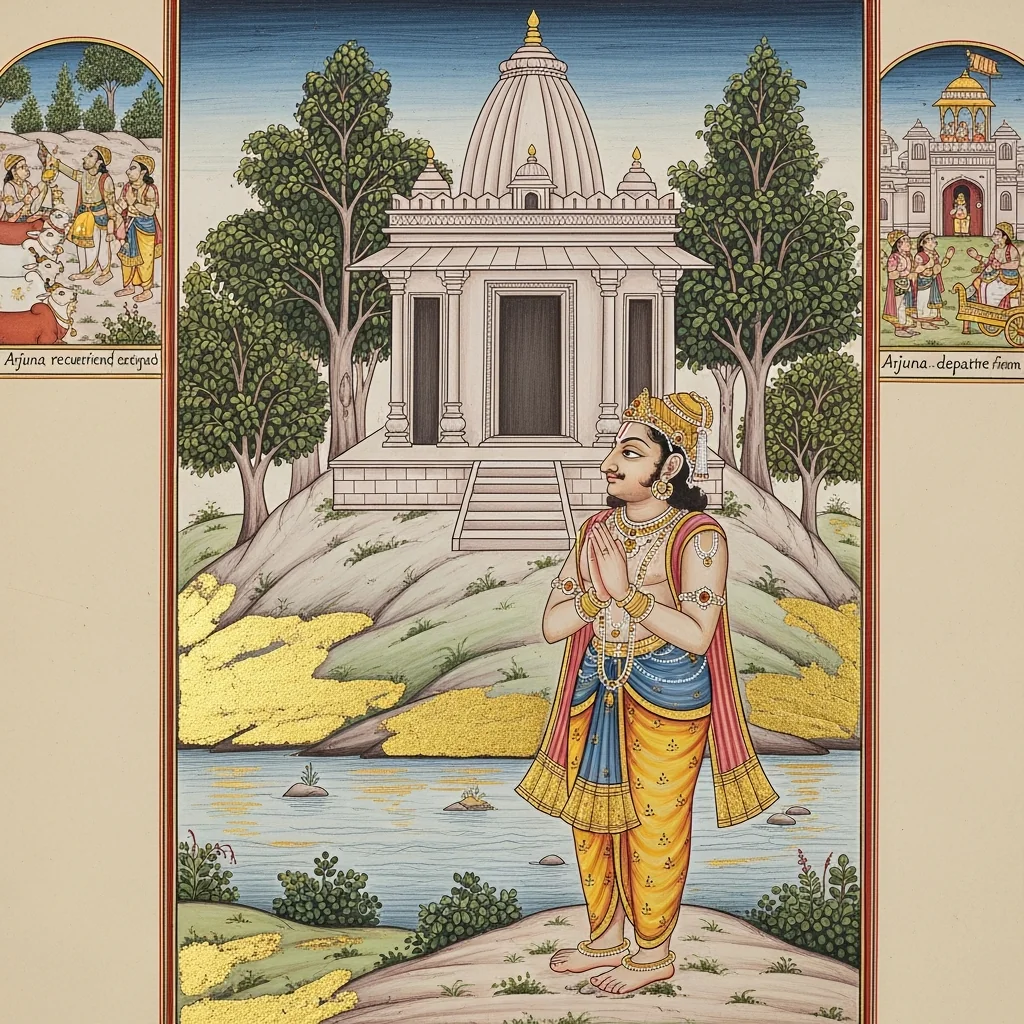 अर्जुनस्य तीर्थयात्रा-प्रसङ्गः तथा सुवर्णमुखरी-वेङ्कटाचल-प्राप्तिः (Arjuna’s Pilgrimage Prelude and Arrival at Suvarṇamukharī and Veṅkaṭācala)