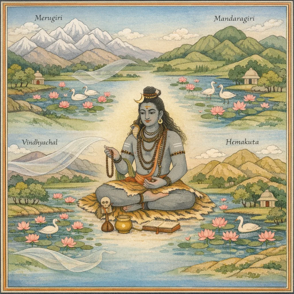 Rather than prescribing a direct social rule, the text frames Earth’s stability through ordered geography: named mountains and lakes function as a schematic of terrestrial structure. The implicit instruction is that maintaining the integrity of waters (saras, tīrthas) and forested habitats sustains a balanced world, aligning sacred order with environmental continuity.