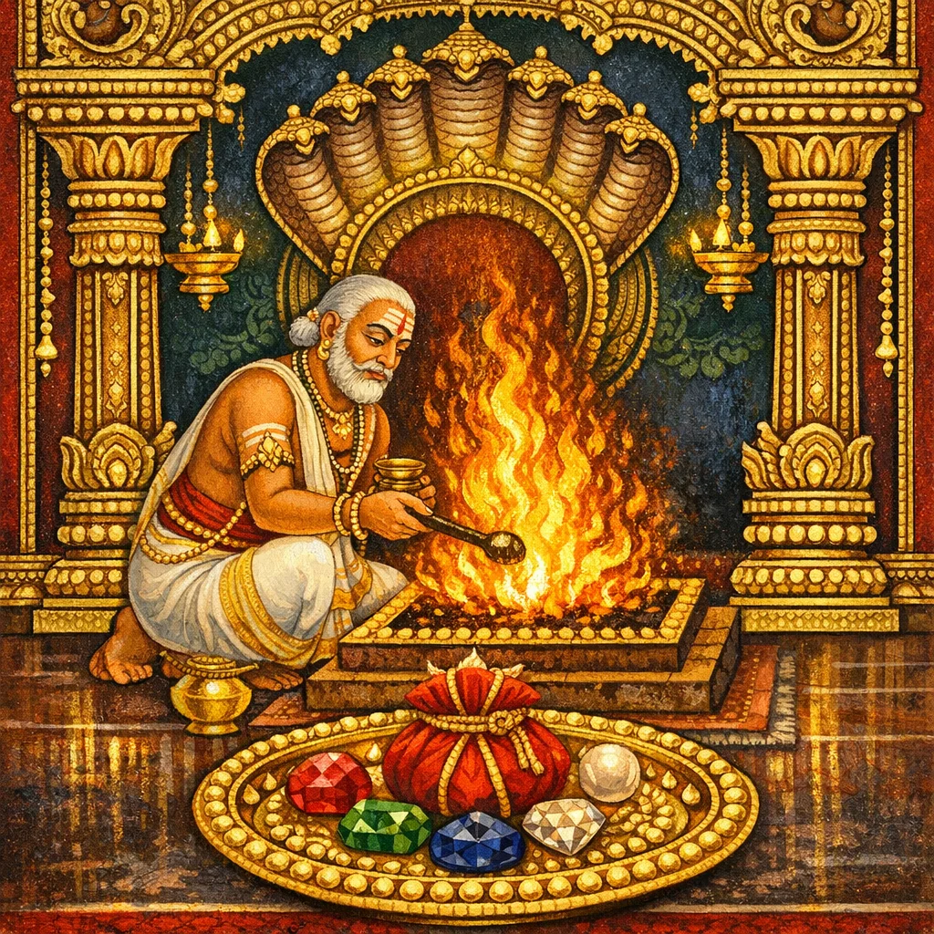 Protection is emphasized through the Ananta-mantra (invocation at the doorway) and the praṇava (Oṁ) used with a rakṣā-pōṭalī; the rite also includes śānti-homa and corrective oblations to remove nyūna-doṣa (defects of deficiency).