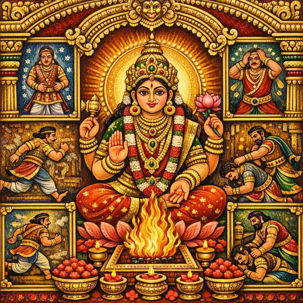 Bab ini memperkenalkan Trailokya-vijayā, suatu vidyā kemenangan yang diajarkan oleh Īśvara, sebagai penangkal yang “menghancurkan” yantra musuh dan daya penghalang. Teks terlebih dahulu memelihara variasi bacaan yang memperhalus gelaran mantra—menekankan pemusnahan dukacita, keupayaan mengatasi mantra lain, serta penyingkiran musuh, penyakit dan kematian—sebelum masuk kepada wahyu teras. Ritusnya berpusat pada pemanggilan Jaya dalam rupa murka: berwarna biru, diiringi preta-gaṇa, divisualkan bertangan dua puluh, dengan rangkaian mantra yang memerintah menusuk, memotong, dan menakluk dengan kemenangan “atas tiga dunia”. Pengamal melakukan pañcāṅga-nyāsa dan mempersembahkan bunga merah ke dalam api (homa), menghubungkan pensakralan dalaman (nyāsa) dengan persembahan luaran. Formula tambahan kemudian menyenaraikan operasi paksaan—stambhana (menahan), mohana (memukau/mengelirukan), drāvaṇa (menghalau), ākarṣaṇa (menarik)—serta hiperbola kosmik (menggerakkan gunung, mengeringkan lautan), dan berakhir dengan aplikasi menundukkan musuh melalui imej tanah yang dikaitkan dengan suatu nama ular.