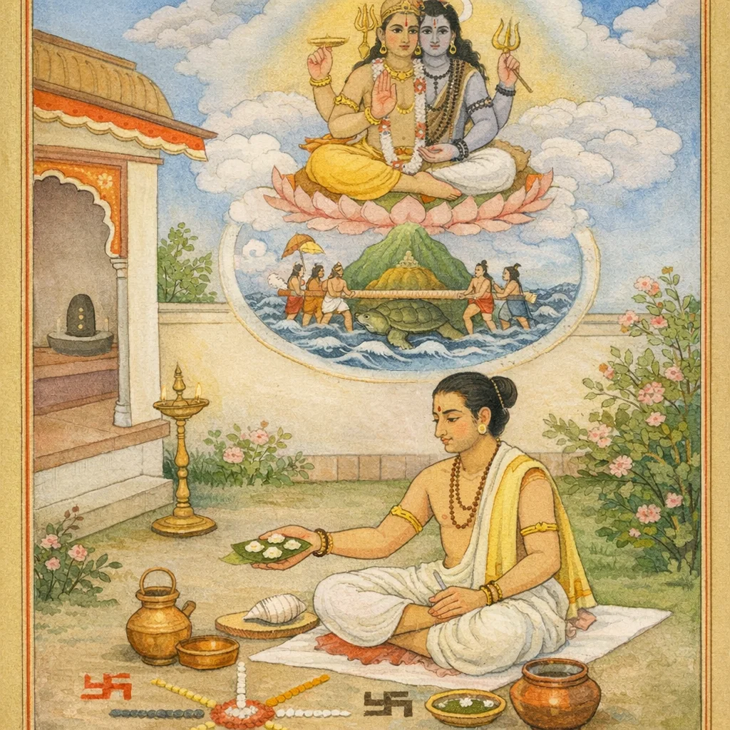 Demikianlah, dalam Śrī Kūrma Purāṇa, dalam Ṣaṭsāhasrī Saṃhitā, bahagian kemudian, bermulalah bab kelapan belas. Vyāsa bersabda: Hendaklah seseorang makan menghadap timur, atau menghadap matahari; duduk di atas tempat duduk yang suci lagi bersih, dengan kedua-dua kaki diletakkan di bumi.
