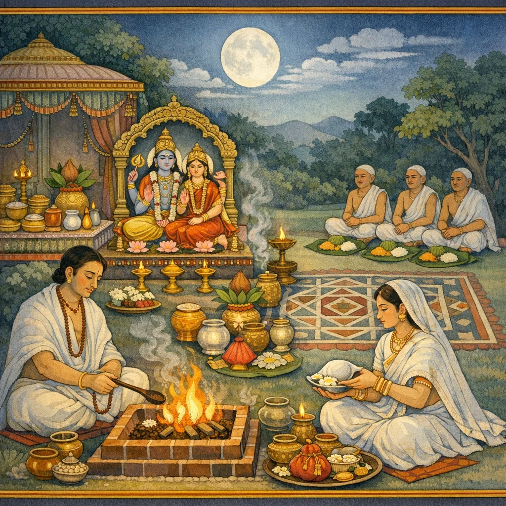Śauca (bath, white clothing, ācamana), saṅkalpa, Lakṣmī–Nārāyaṇa pūjā with upacāras, gṛhya-homa with ghee/sesame offerings and prescribed sūktas, fasting on Pūrṇimā, Chandra-arghya with akṣata and white flowers, night vigil with Purāṇa-śravaṇa, next-day worship and Brāhmaṇa-feeding, and annual udyāpana with maṇḍapa/kumbha/pratimā-dāna and tila-homa.