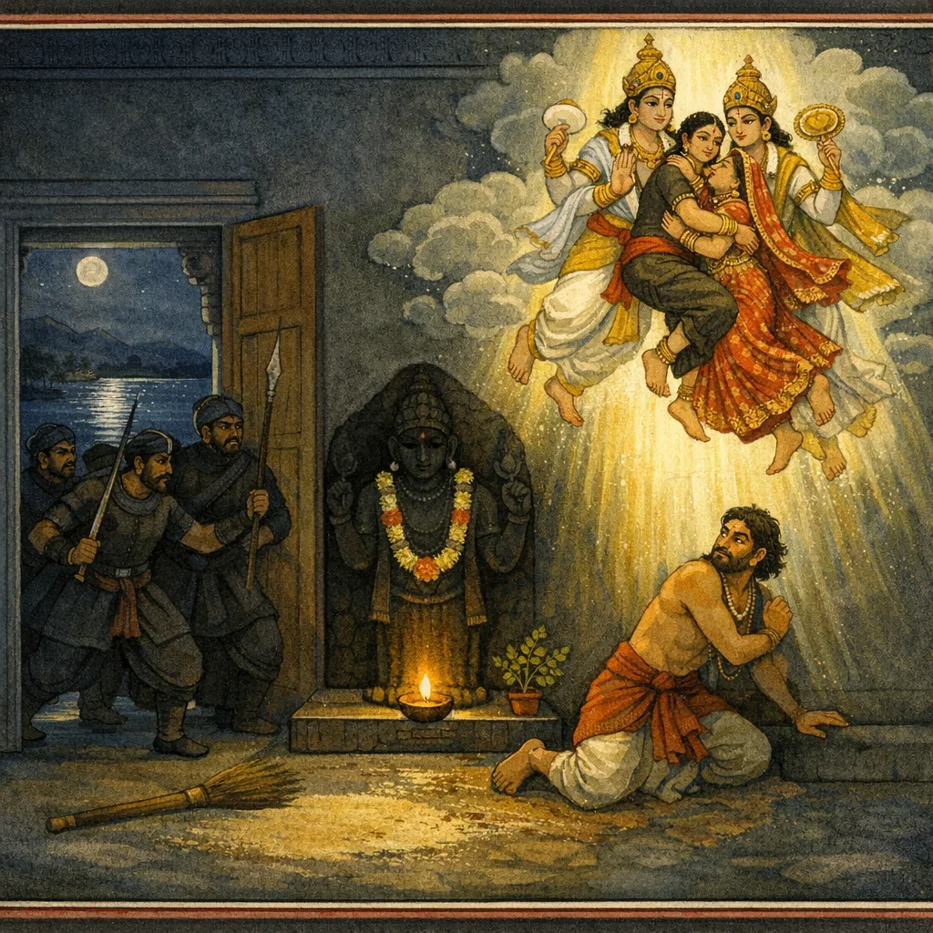 Melihat rumah suci Viṣṇu kosong, lelaki yang dikuasai nafsu itu masuk bersama seorang wanita. Pada waktu malam, dengan niat menikmati syahwat, dia berbaring di sana.
