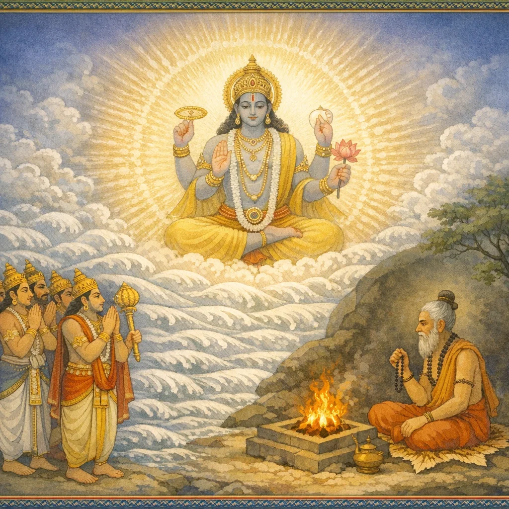 Tuhan Yang Maha Mulia berfirman: “Aku mengetahui dukacita dalam hati kamu yang timbul daripada tapa Mṛkaṇḍu. Para dewa tidak mengganggu kamu; resi itu adalah yang terunggul dalam kalangan orang saleh.”