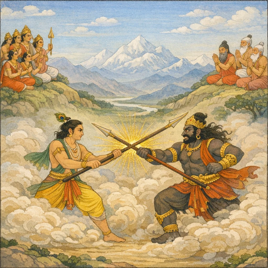Dengan daya mantra-mantra ini, dua wira agung itu bertempur dalam pertempuran yang menakjubkan. Seolah-olah menjadi sādhaka antara satu sama lain, masing-masing menyempurnakan kuasa mantranya terhadap lawan, lalu menzahirkan kekuatan dan keberanian yang maha besar.